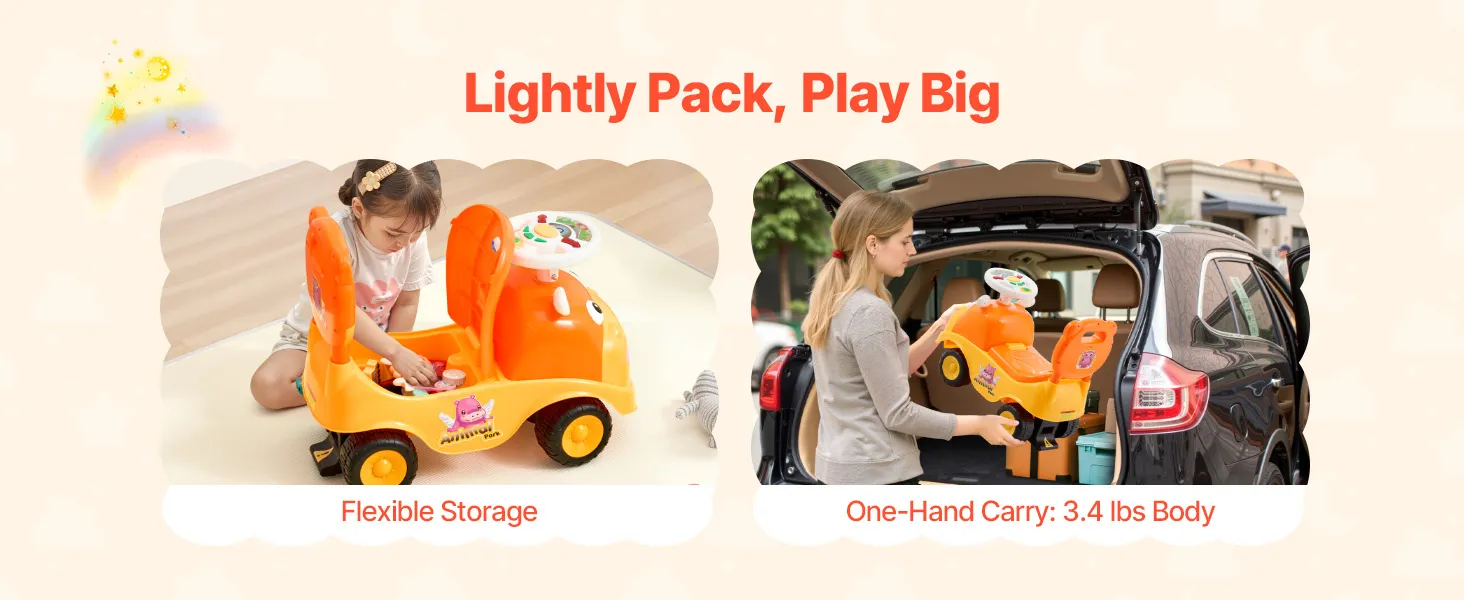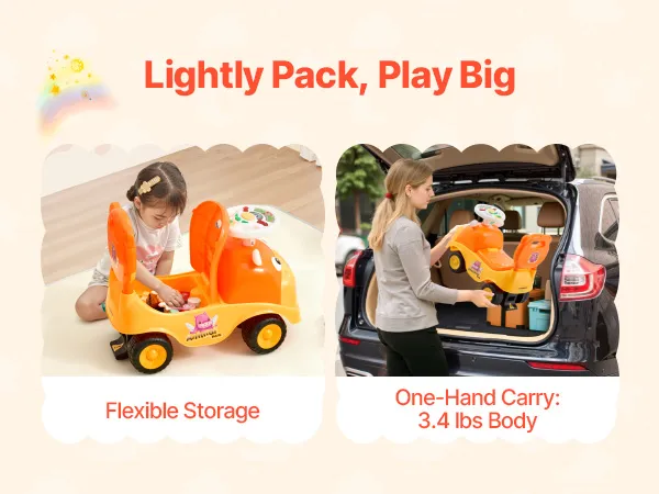 Dankzij het praktische opbergvak onder de stoel kunnen moeders de loopauto met één hand dragen. Klaar voor een zorgeloos avontuur!
