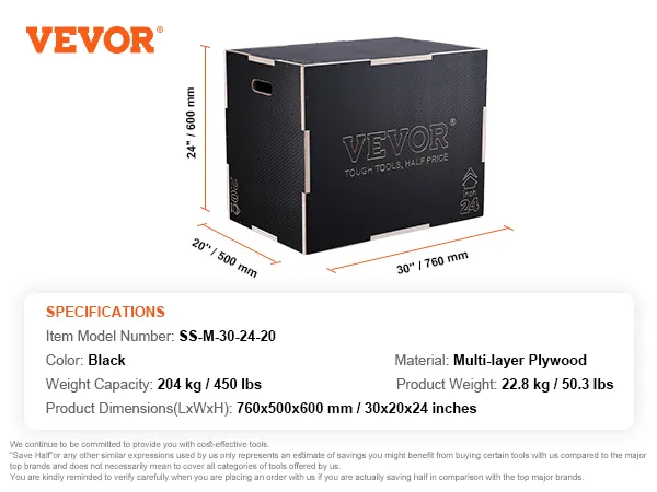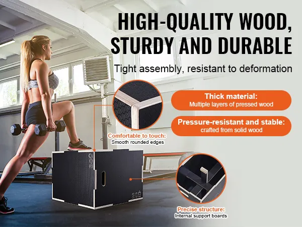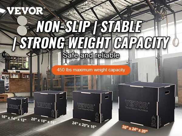 De VEVOR 3-in-1 plyometrische jump box is gemaakt van dik, meerlaags multiplex. Dit zorgt ervoor dat het intensieve trainingen en zware gewichten aankan. Het ondersteunt tot 450 lbs. Daarom is het geschikt voor alle lichaamstypen. Stevige constructie betekent dat u erop kunt vertrouwen voor alles wat uw fitnessbehoeften zijn. Het antislipoppervlak voegt een extra laag veiligheid toe. U voorkomt ongelukken tijdens intensieve oefeningen. Deze duurzaamheid betekent dat het jarenlang meegaat en consistente prestaties levert. U kunt erop vertrouwen dat deze box u ondersteunt bij elke sprong en stap.