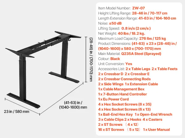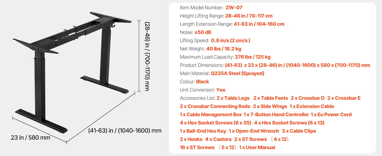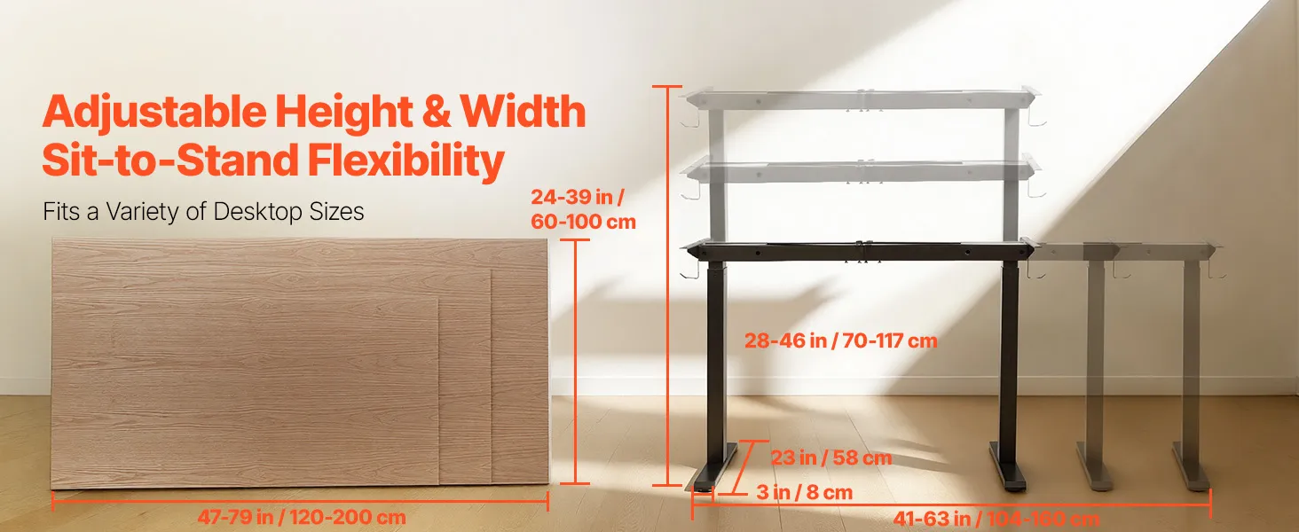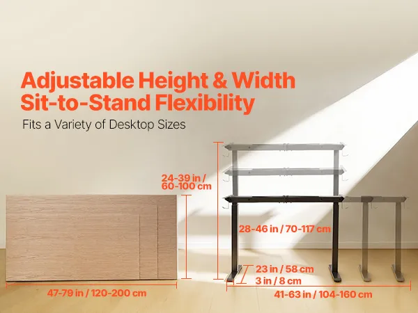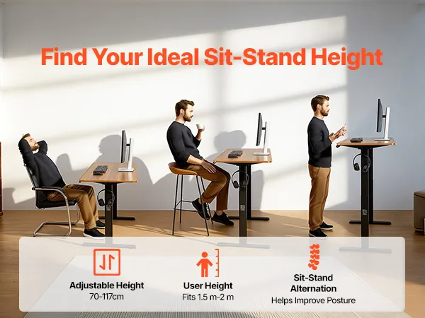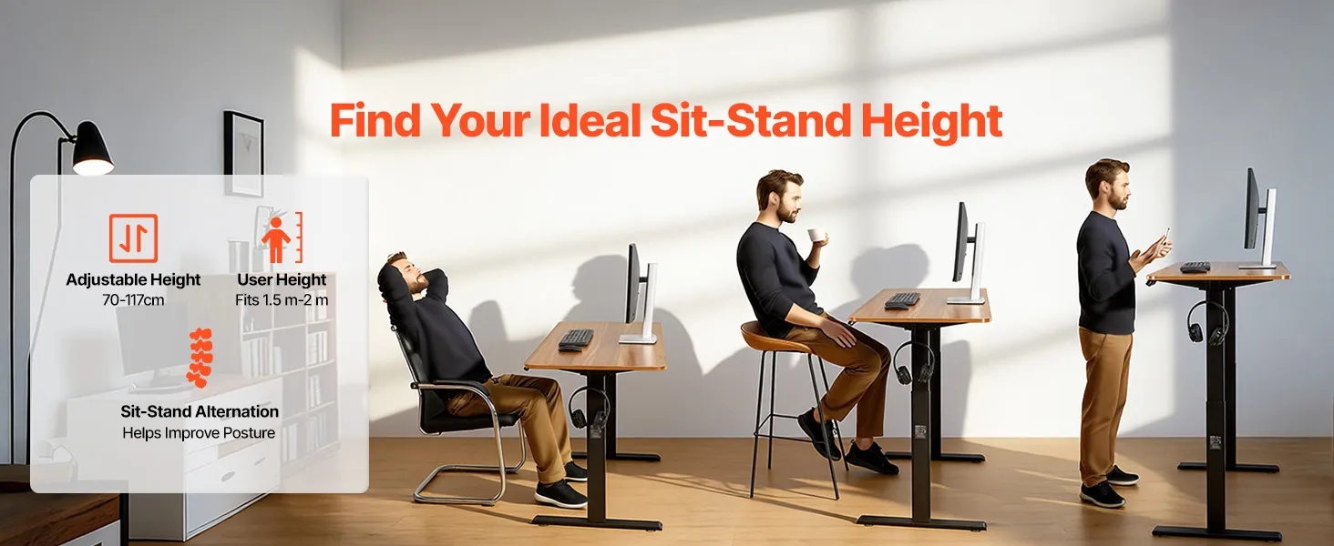 Zitten en staan: Het bureauframe is in hoogte verstelbaar van 70 cm tot 117 cm en uitschuifbaar van 104 cm tot 160 cm. Het is geschikt voor gebruikers met een lengte tussen 150 cm en 200 cm en zorgt voor een comfortabele houding, zowel zittend als staand.