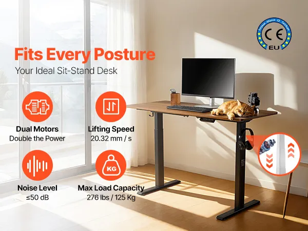 Dubbel motorsysteem: Het dubbele motorsysteem maakt een hefsnelheid van 2 cm/s mogelijk en een geluidsniveau onder de 50 dB voor soepele en stille verstellingen. De tafelpoten, gemaakt van hoogwaardig koolstofstaal, bieden een stabiele constructie met een draagvermogen van 125 kg.