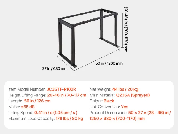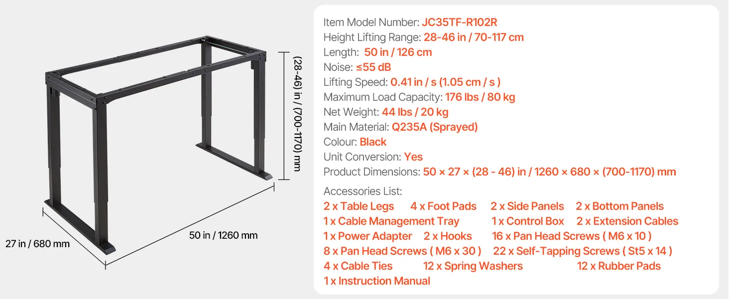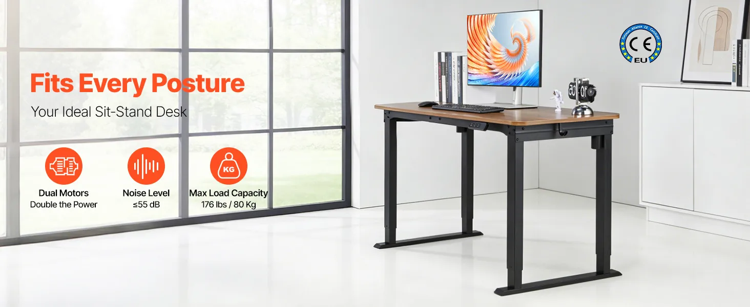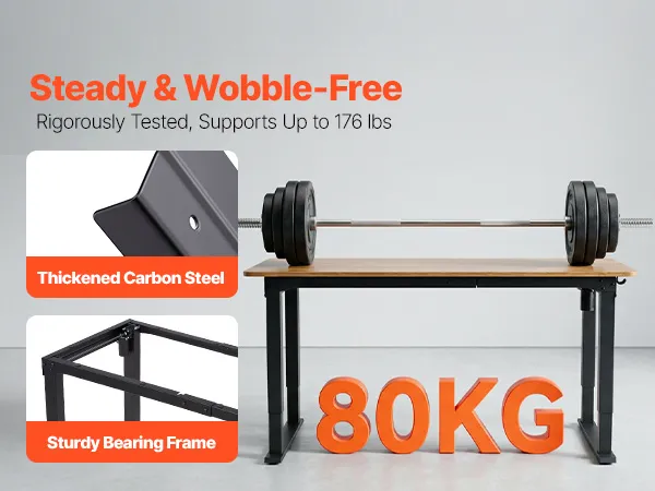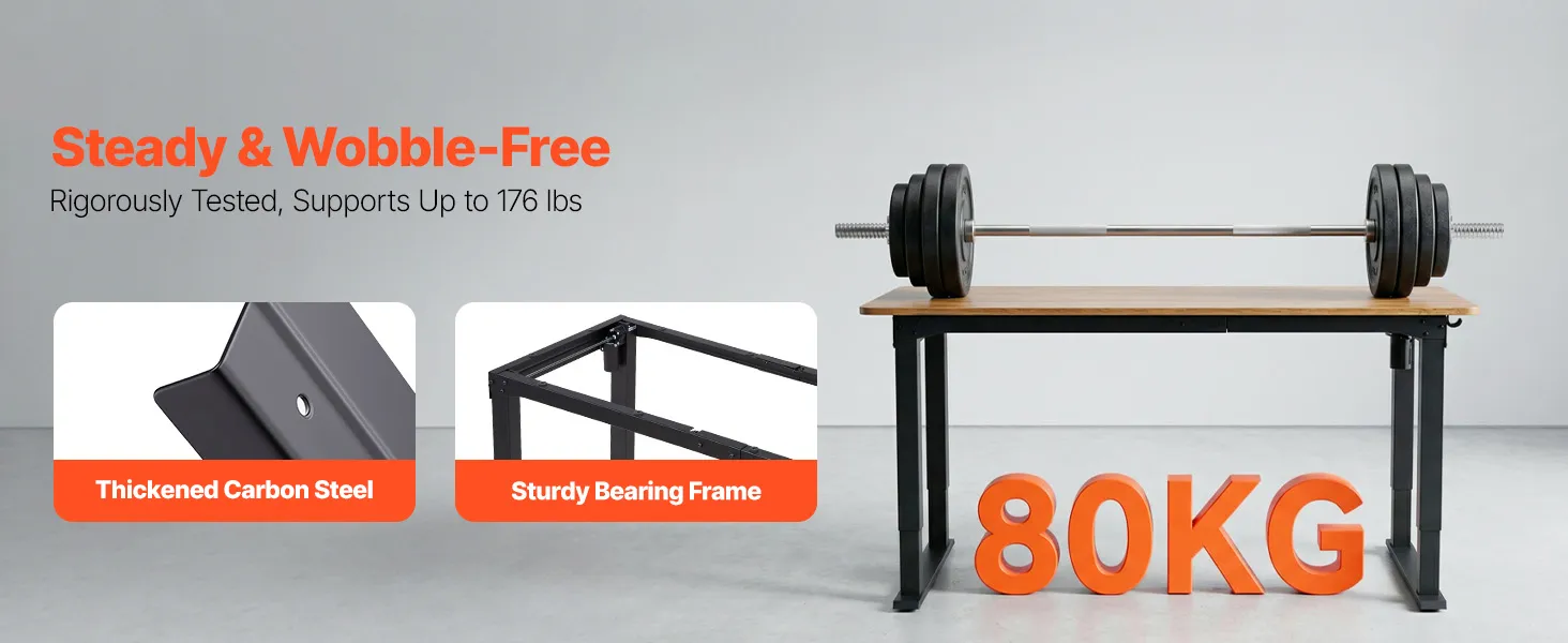 Dubbelmotorsysteem: Presteert beter dan bureaus met één motor, met een hefsnelheid van 1,05 cm/s en een geluidsniveau onder de 55 dB voor uitzonderlijk comfortabel werken. De bureaupoten, gemaakt van hoogwaardig koolstofstaal, bieden stabiliteit en ondersteuning tot 80 kg.