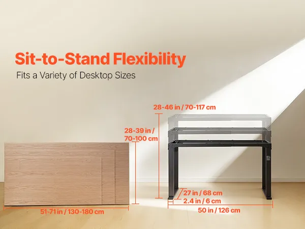 Zitten en staan: Het frame van het staande bureau is in hoogte verstelbaar van 70 tot 117 cm. Geschikt voor gebruikers met een lengte tussen 150 en 200 cm, zodat u de ideale houding kunt vinden om te werken, staan of ontspannen thuis.