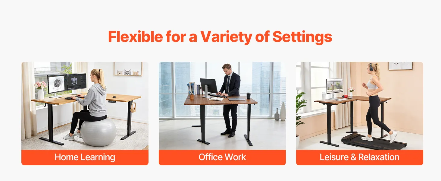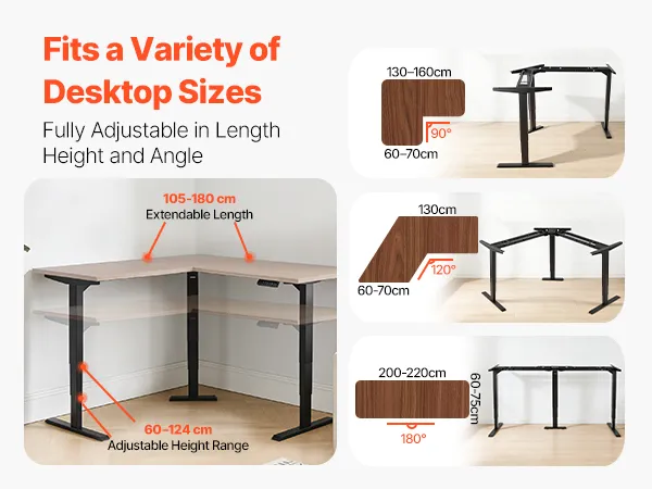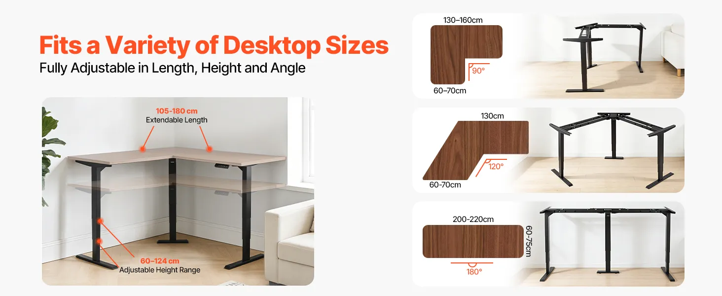 Veelzijdige compatibiliteit met tafelbladen: Dankzij de hoogwaardige tafelpoten is dit frame compatibel met veel verschillende tafelbladvormen, waaronder hoeken van 90°, versteksneden van 120° en rechte tafelbladen van 180°, waardoor u uw werkruimte naar wens kunt inrichten.