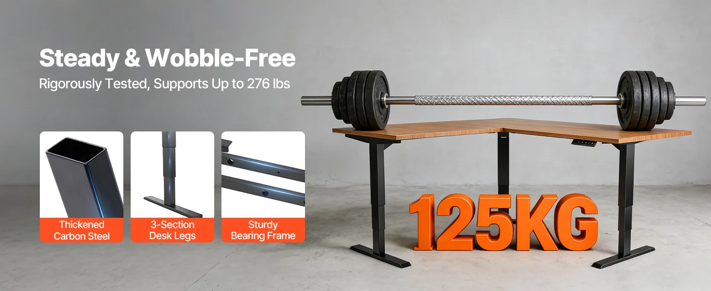 Drie-motorsysteem: Deze krachtige, in hoogte verstelbare bureauframes presteren beter dan bureaus met één motor, met een hefsnelheid van 32 mm/s en een geluidsniveau onder de 50 dB. Gemaakt van hoogwaardig Q235A koolstofstaal, kunnen ze tot 125 kg dragen en zorgen ze voor een stabiele werkplek.
