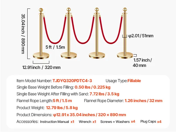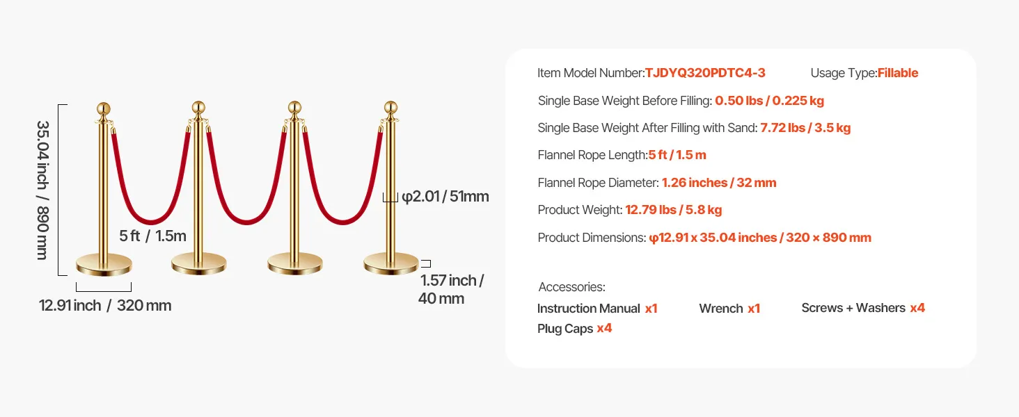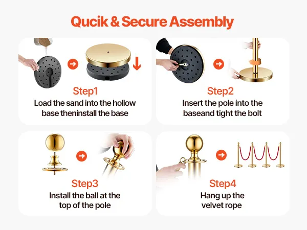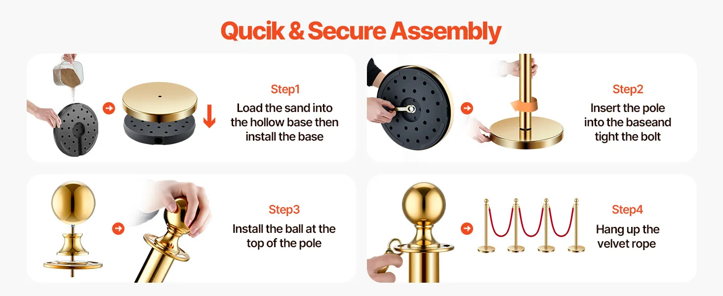 Quick Assembly: No tools required! Simply screw the base into place, fill it with sand, and your velvet rope crowd control is ready to go. Easy to set up and even easier to use whenever you need it.