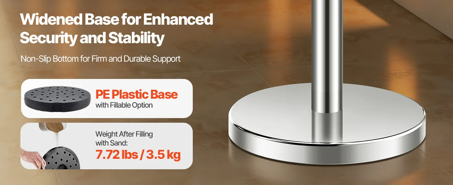 Sturdy & Secure: With a wide, non-slip base and a fillable design, our crowd control barrier is built to last. The fillable base can hold up to 7.72 lbs / 3.5 kg when filled with sand, withstanding both direct sunlight and sudden impacts without fail.