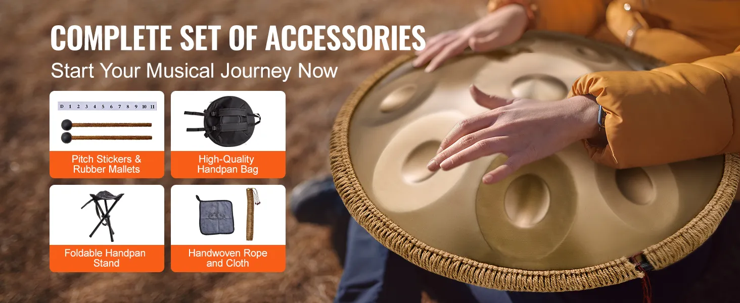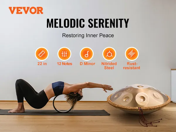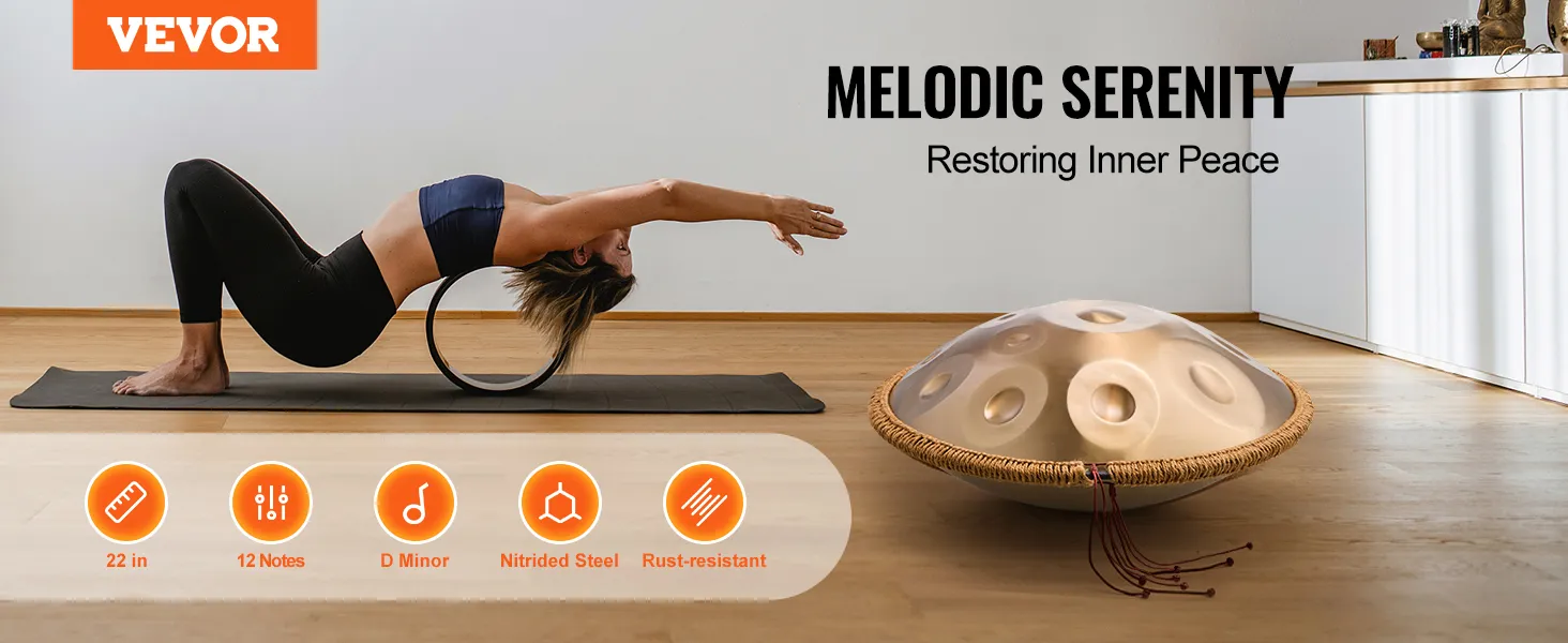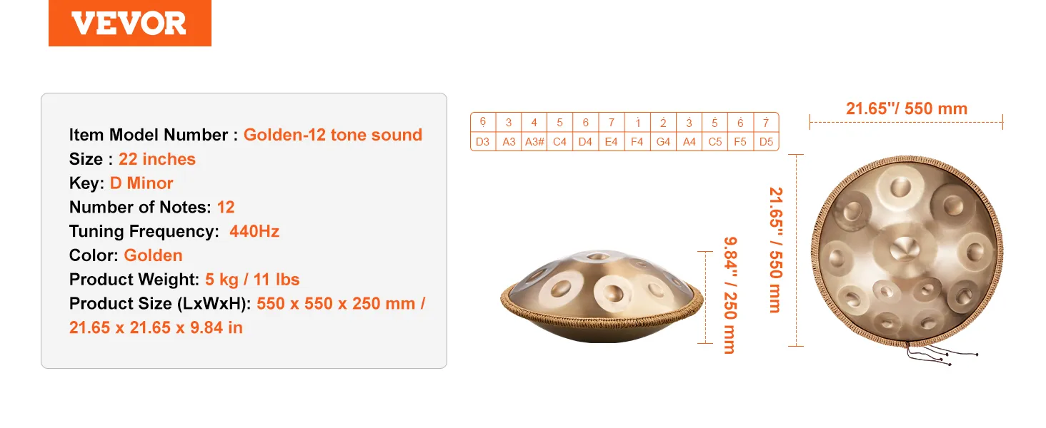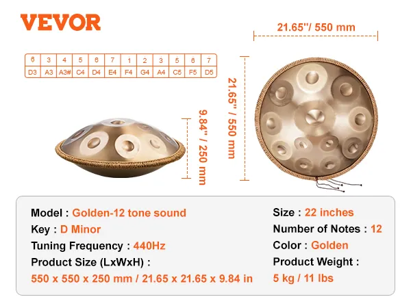 This 22-inch D minor hand pan drum is made of high-quality carbon steel and covers 12 tones, presenting a deep golden color. It is ideal for beginners to quickly get started and bring you the ultimate musical enjoyment with its pleasant, clear, and long-lasting tone.