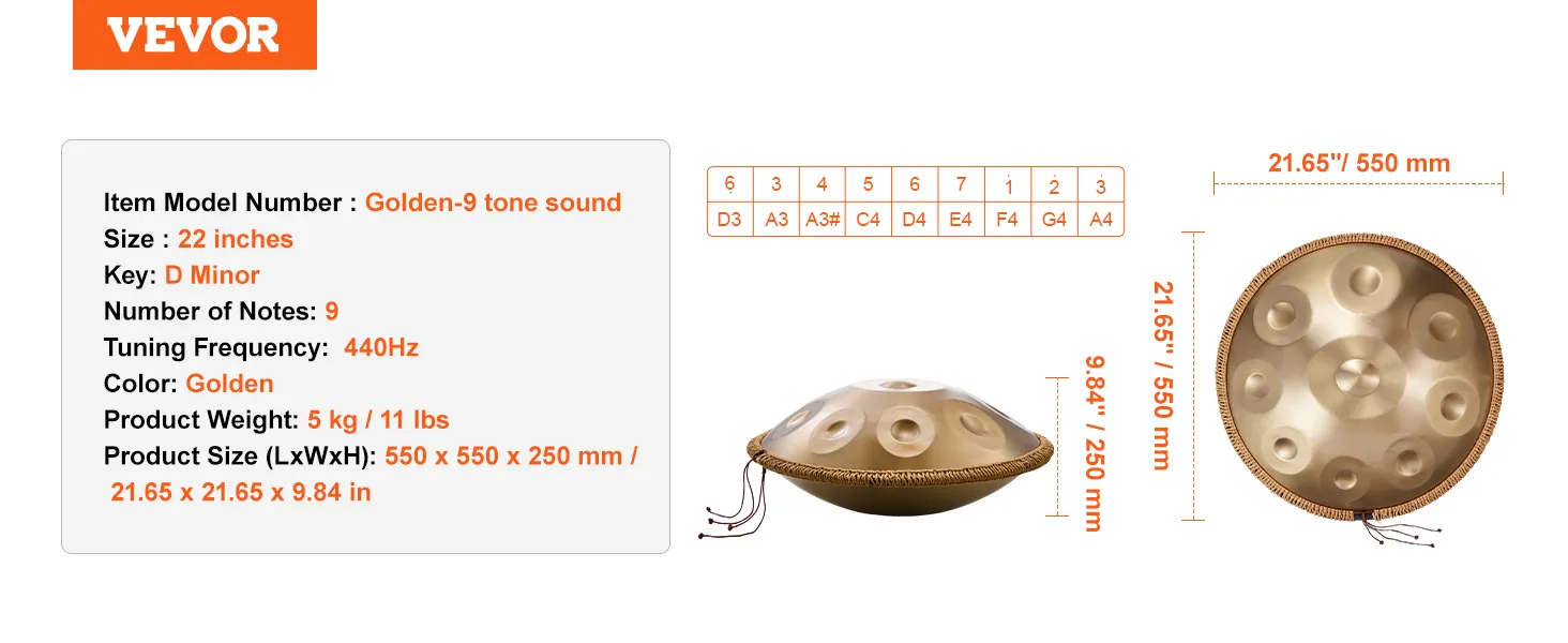 Professionele handpantrommel: de 550 mm handpantrommel is uitgerust met 9 tonen en de toonsoort D mineur, met behulp van geavanceerde stemtechnologie, die niet alleen geschikt is voor professionele optredens, maar ook zeer geschikt is voor beginners om te leren en te gebruiken.