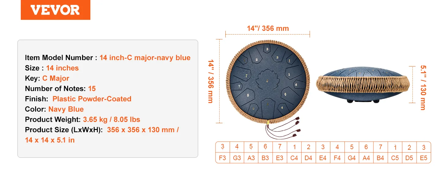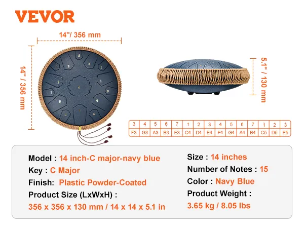 Deze 356 mm stalen tongtrommel in C majeur is zorgvuldig vervaardigd uit koolstofstaal en bevat 15 noten in diep marineblauw. Het is ideaal voor beginners die snel aan de slag willen en biedt het ultieme muzikale plezier met zijn aangename, heldere en langdurige toon.