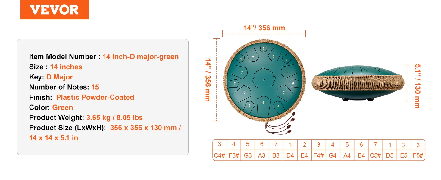 VEVOR 14 in Steel Tongue Drum 15 Notes D Major Key