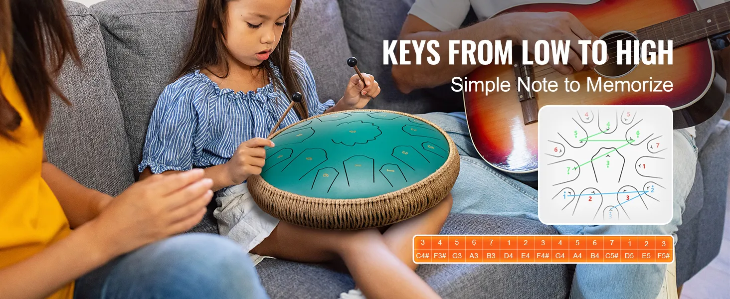 Beginner-Friendly Instrument: This steel tongue drum comes with complete accessories that make it easy for anyone to play. The ethereal tank drum's metal tongue vibrates to produce a pleasant sound, making it suitable for children and beginners without any music experience.
