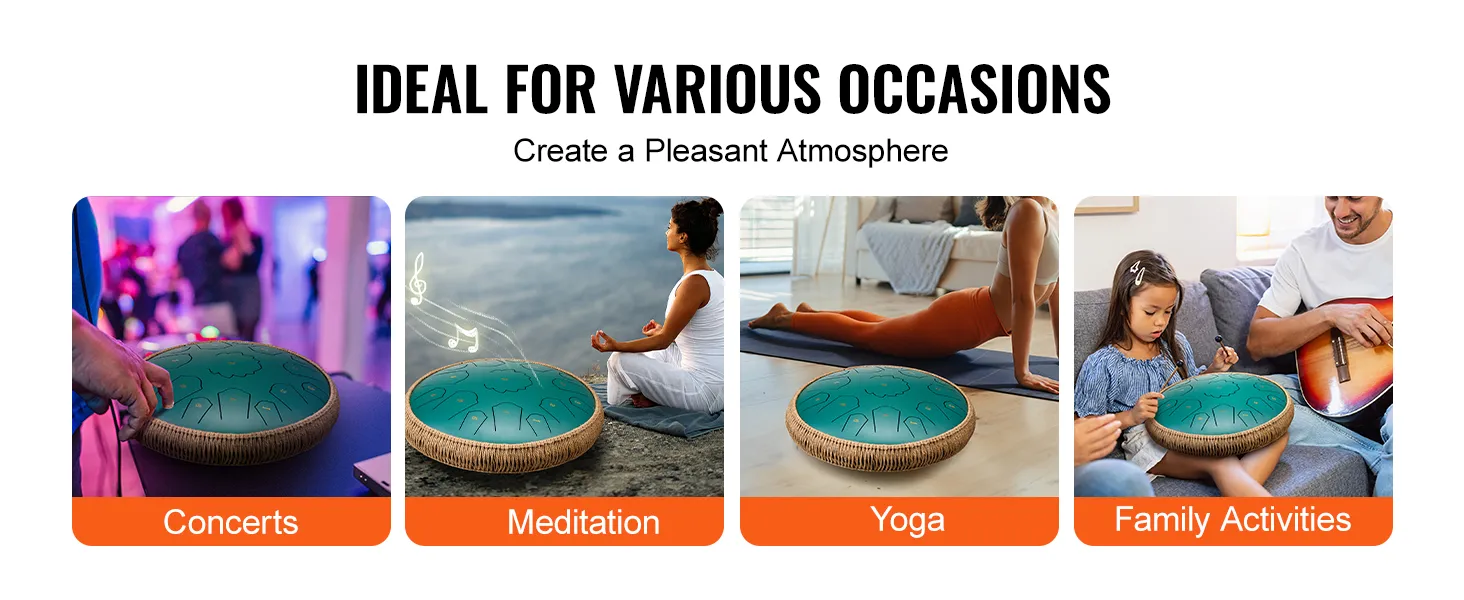 Handgemaakte stalen tongdrum: met deze 15-tonige stalen tongdrum met C-sleutelontwerp kun je complexe liedjes en rustgevende harmonieën spelen. Dankzij verbeterde stemtechnologie is de stalen tongdrum van 356 mm geschikt voor zowel professionele optredens als beginners.