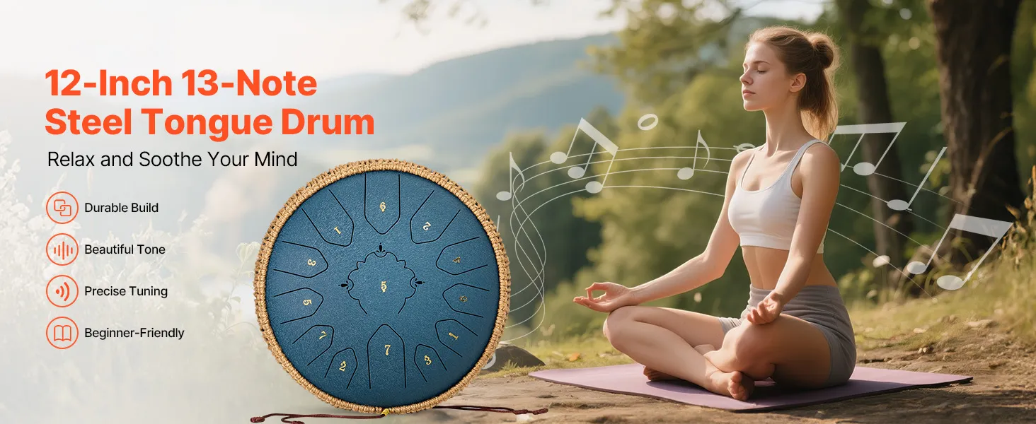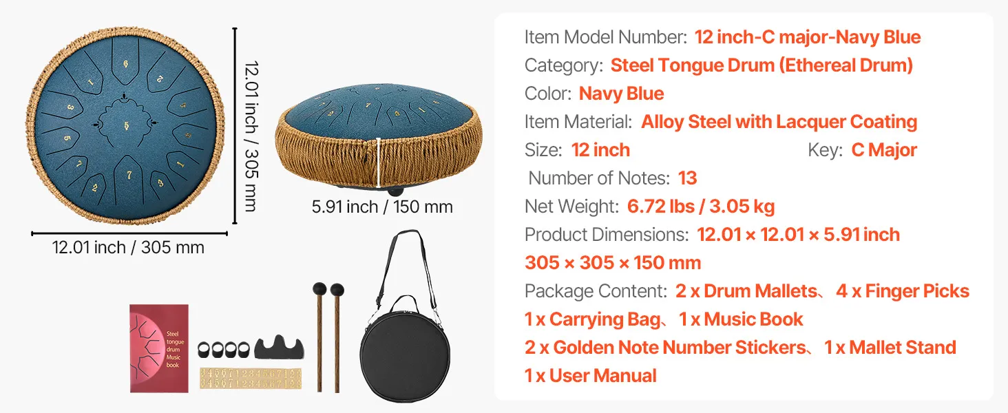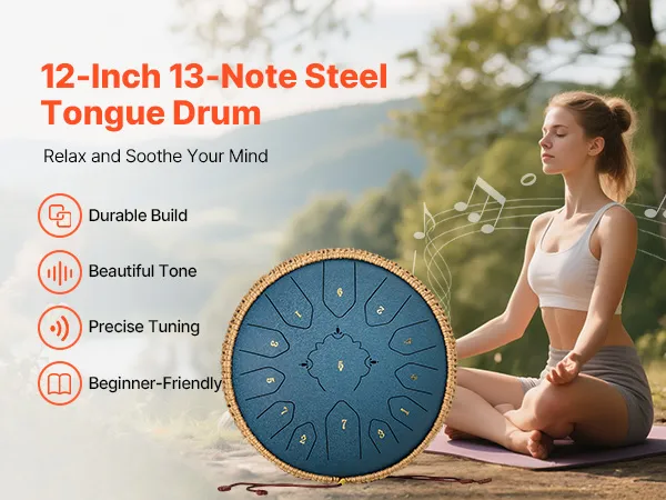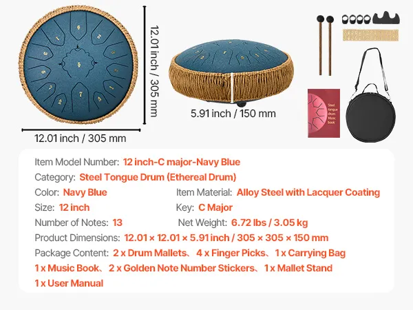 VEVOR Tongue Drum, Ø305 mm, 13 tonen, Rain Drum, C majeur, met muziekboek en stokken, percussie-instrument voor meditatie, yoga en muziekonderwijs voor beginners, Steel Tongue Drum, marineblauw