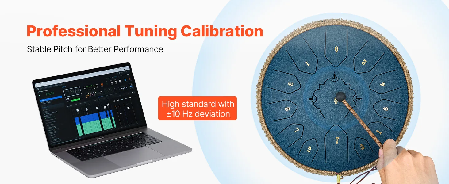 Onze tongdrum wordt nauwkeurig gestemd door professionele stemmers om een exacte toonhoogte te garanderen. Dit zorgt ervoor dat de gespeelde melodie harmonieus en mooi klinkt. Dankzij het gebruik van hoogwaardige materialen blijft de toonhoogte stabiel en vervaagt deze niet, zelfs niet bij langdurig gebruik.