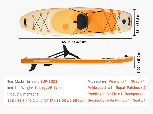 Uitgebreide accessoireset: het opblaasbare stand-up paddleboard bevat een zitje, een bidirectionele pomp, een verstelbare peddel, een afneembare vin, een rugzak met grote capaciteit, een enkelband, een sleutel, een band en twee reparatiepleisters – alles wat u nodig hebt voor waterplezier.