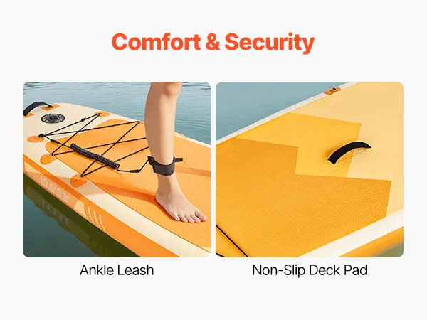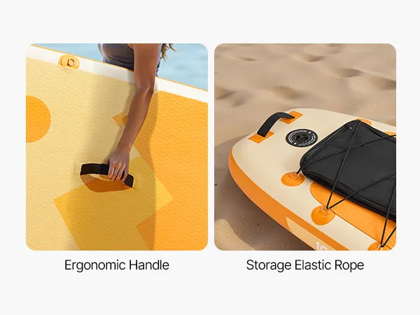 Het stand-up paddleboard is gemaakt van nieuw, ultralicht, tweelaags PVC-materiaal. De binnenkant is voorzien van hoogwaardige borsteltechnologie om de stijfheid van het board te vergroten en het minder gevoelig te maken voor vervorming of beschadiging. De ergonomische handgreep zorgt ervoor dat het board gemakkelijk met één hand te dragen is.
