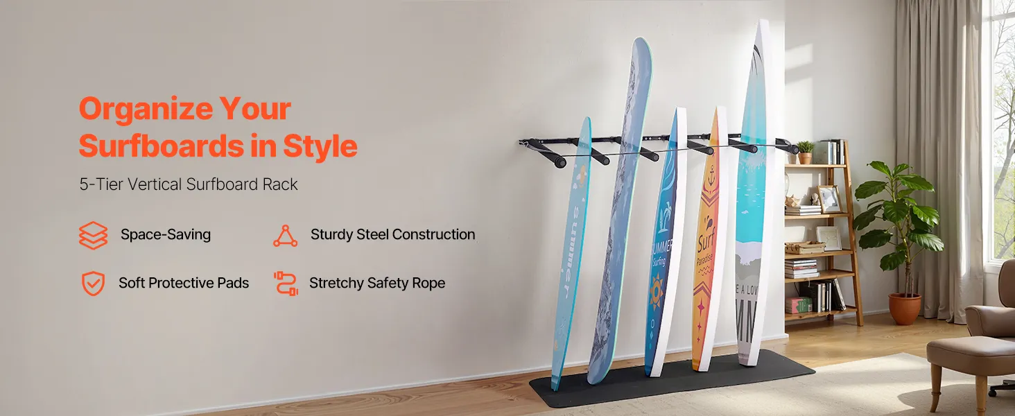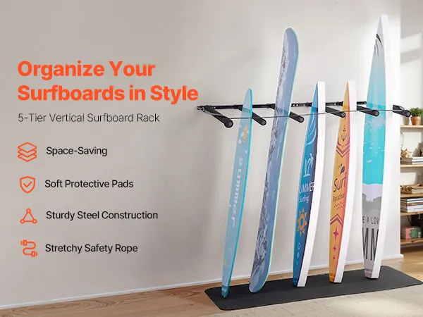 Opbergruimte voor surfplanken: Met dit 5-laags wandrek voor surfplanken kun je je surfplanken tentoonstellen in plaats van ze in de hoeken van je garage of zolder te laten staan. Ideaal voor surfplanken, ski's, skateboards en meer, het benut de muurruimte en bespaart vloerruimte.