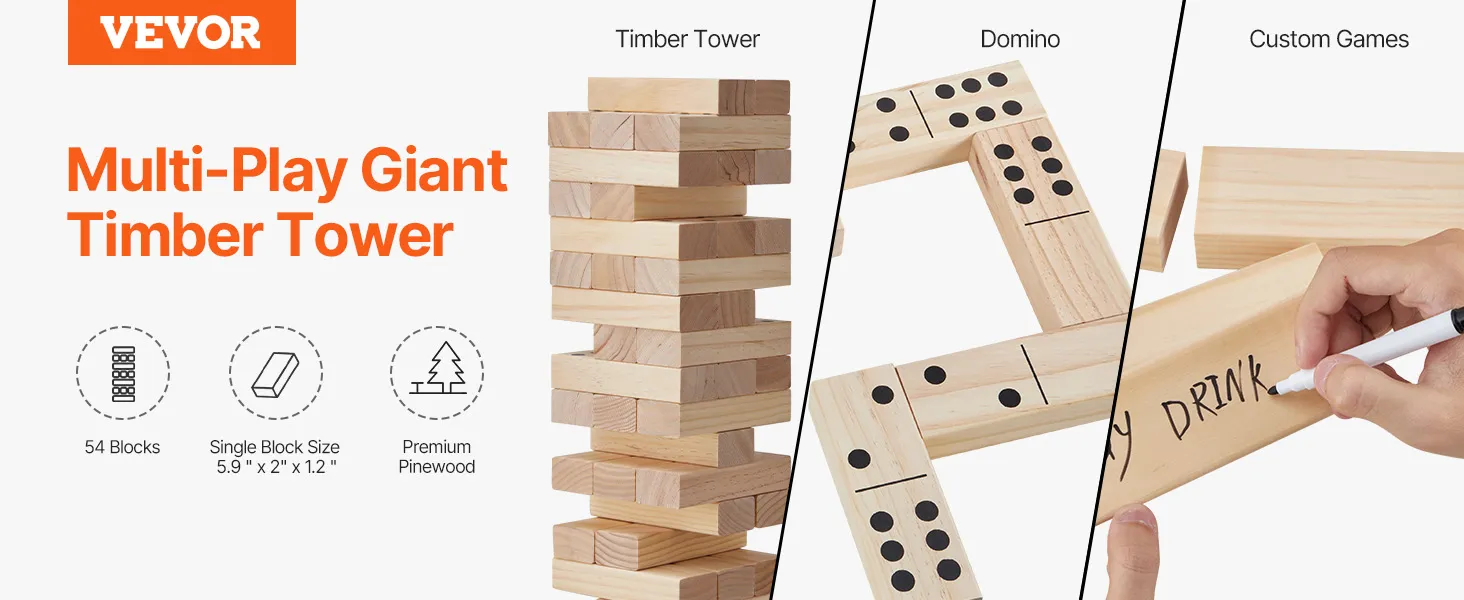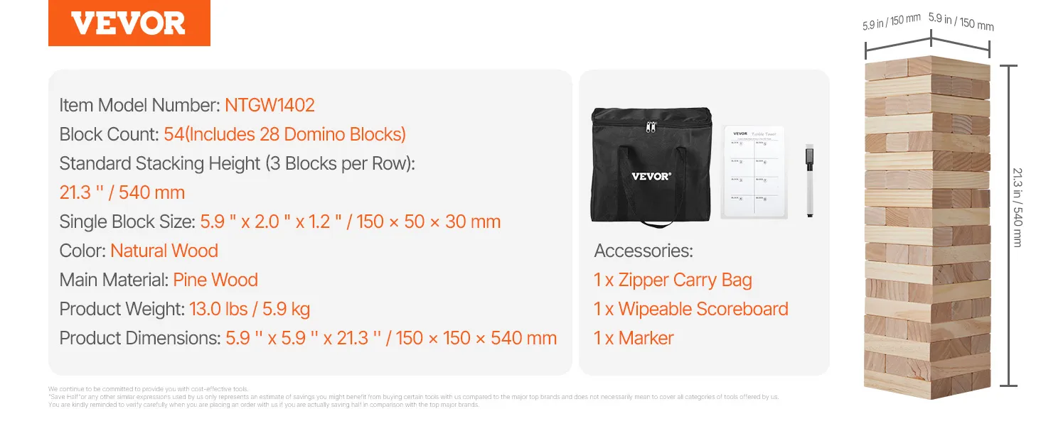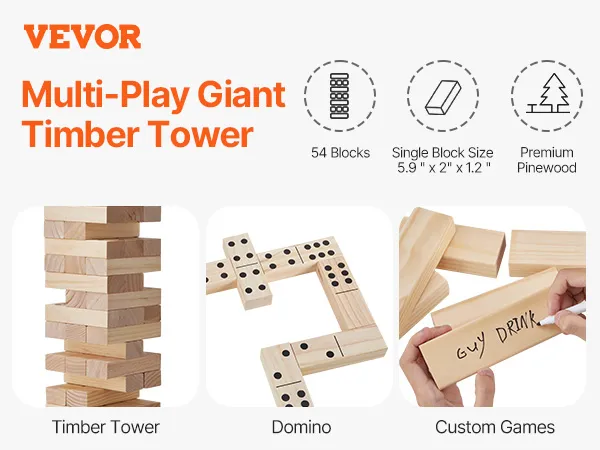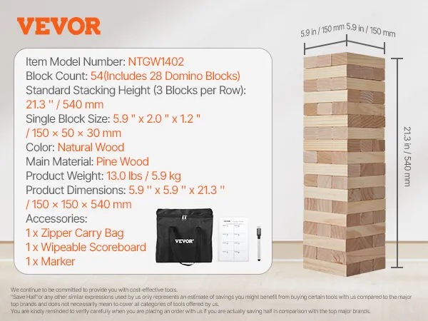 The tumble timber set includes 54 blocks, each measuring 5.9" x 2.0" x 1.2". Among these, 28 blocks feature domino dots, allowing you to enjoy not only timber towers but also dominoes and customized games. Stack the tower as high as 4 feet for even more excitement!