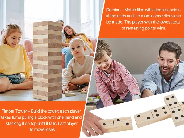 Multiple Ways to Play: The tumble timber set includes 54 blocks, with 28 featuring domino dots, allowing you to play both timber towers and dominoes. You can also customize the game by writing your own rules on the blank blocks, or even use them for doodling as decorative pieces.