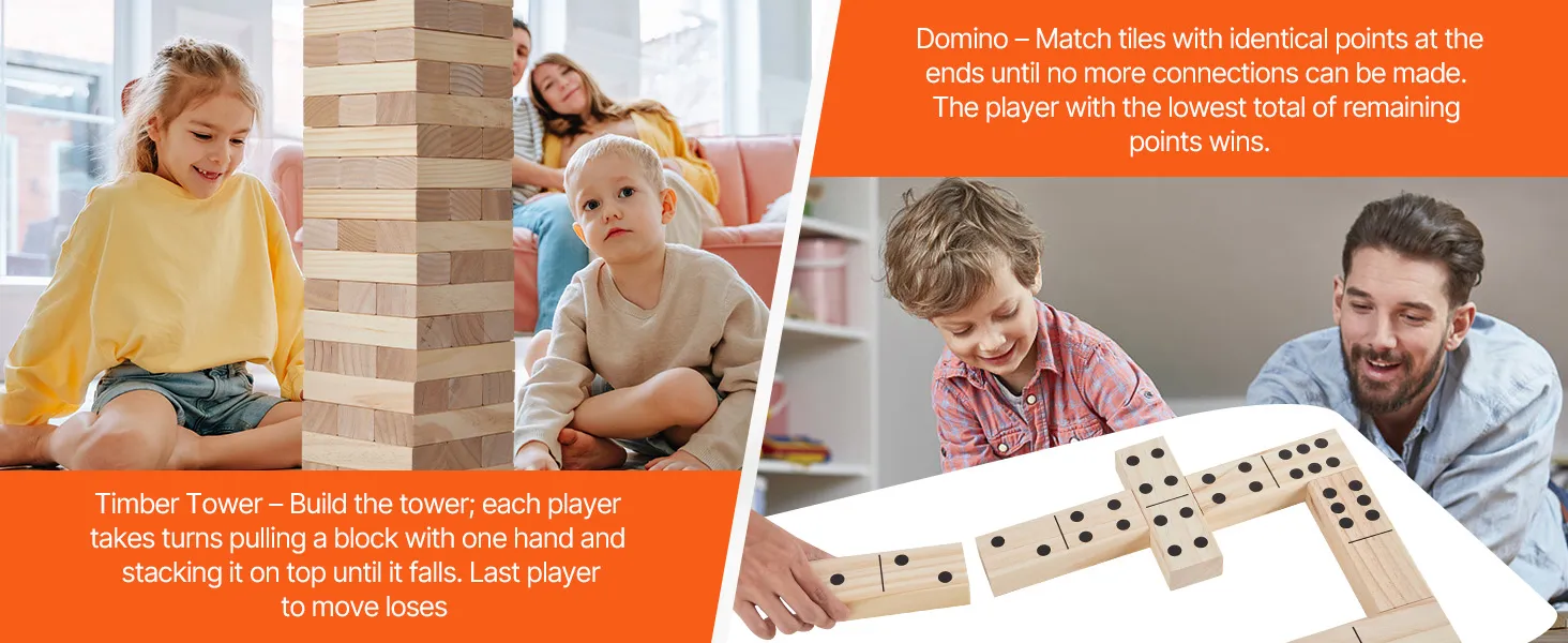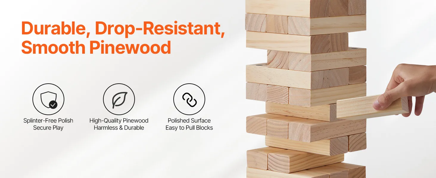 Premium Pinewood: Crafted from high-quality pine wood, this tumble tower blocks game is durable and built to withstand heavy play. Each block is precisely cut, smooth, splinter-free, and crack-free, making it easy to remove blocks during the game.