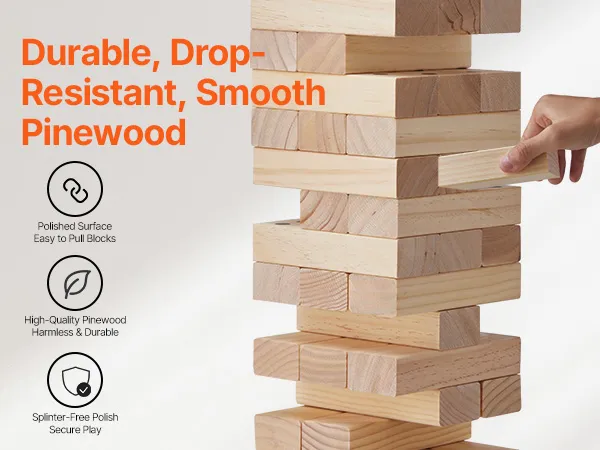 Crafted from high-quality, polished pine wood, this tumbling tower game is non-toxic, durable, and impact-resistant. The smooth, splinter-free surface makes it easier to remove blocks.