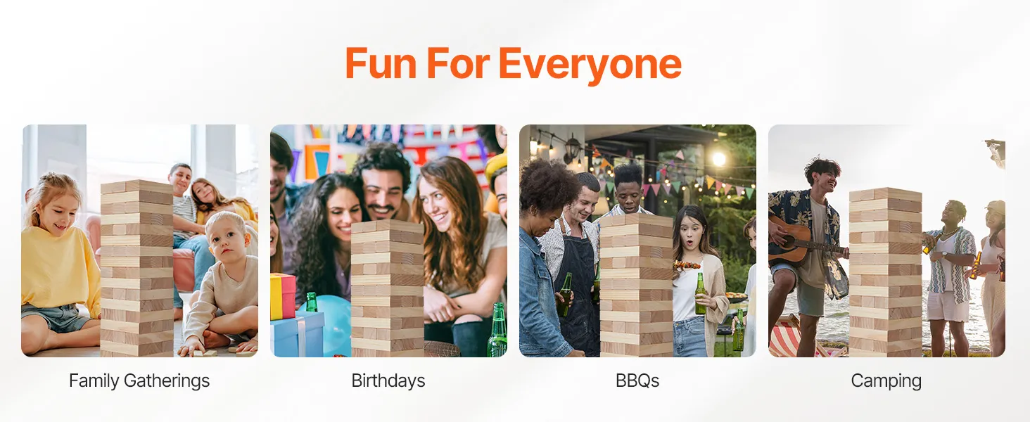 Ideal for Multiple Settings: This tumbling tower game is ideal for both indoor and outdoor use, including backyards, lawns, beaches, and more! It is great for family gatherings, birthday parties, BBQs, picnics, camping, and even solo play!