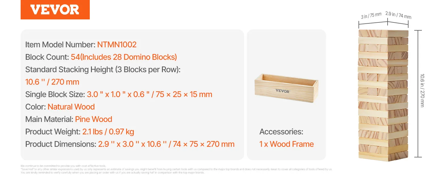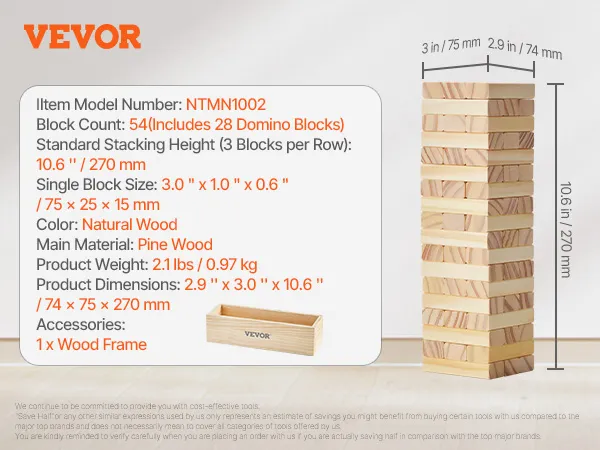 The tumble timber set includes 54 blocks, each measuring 3.0" x 1.0" x 0.6" . Among these, 28 blocks feature domino dots, allowing you to enjoy not only timber towers but also dominoes and customized games. The tower can reach up to 2 feet for an exciting challenge!