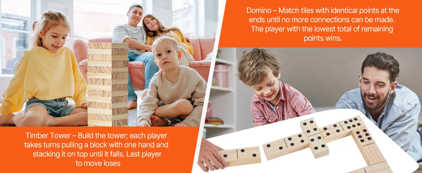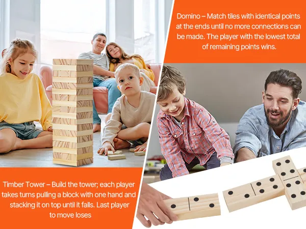 Multiple Ways to Play: The tumble timber set includes 54 blocks, with 28 featuring domino dots, allowing you to play both timber towers and dominoes. You can also customize the game by writing your own rules on the blank blocks, or even use them for doodling as decorative pieces.