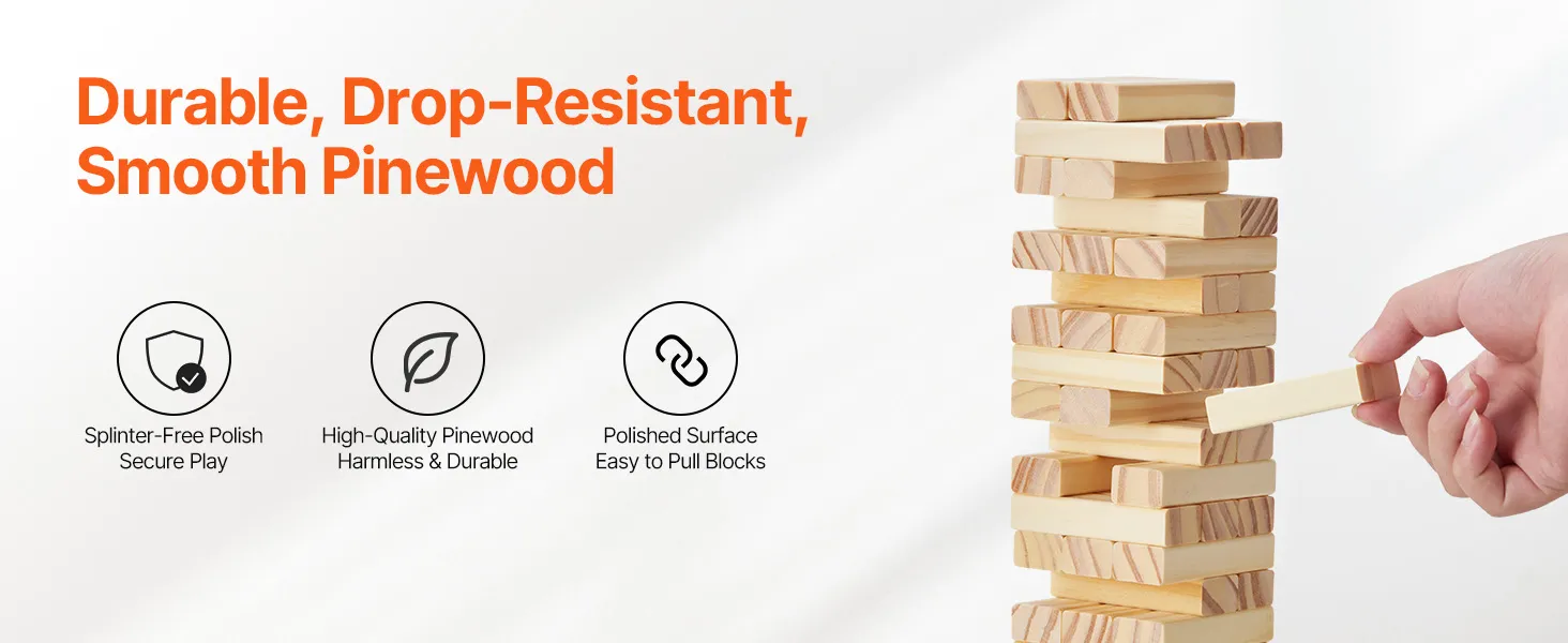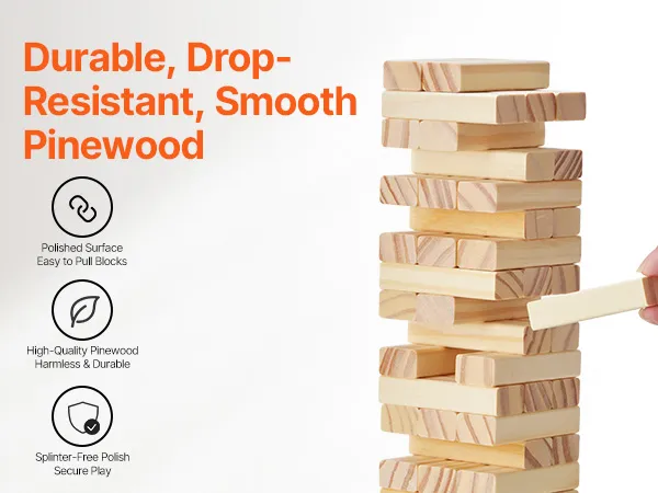 Premium Pinewood: Crafted from high-quality pine wood, this tumble tower blocks game is durable and built to withstand heavy play. Each block is precisely cut, smooth, splinter-free, and crack-free, making it easy to remove blocks during the game.