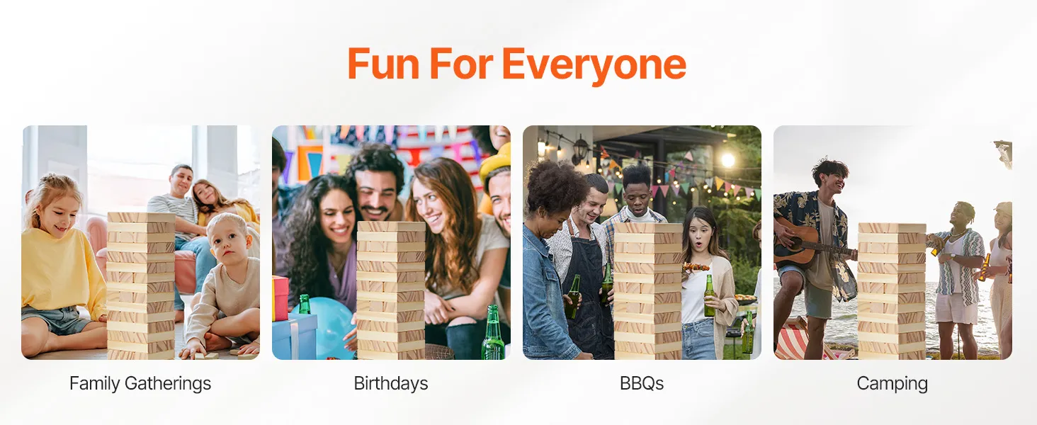 Ideal for Multiple Settings: This tumbling tower game is ideal for both indoor and outdoor use, including backyards, lawns, beaches, and more! It is great for family gatherings, birthday parties, BBQs, picnics, camping, and even solo play!