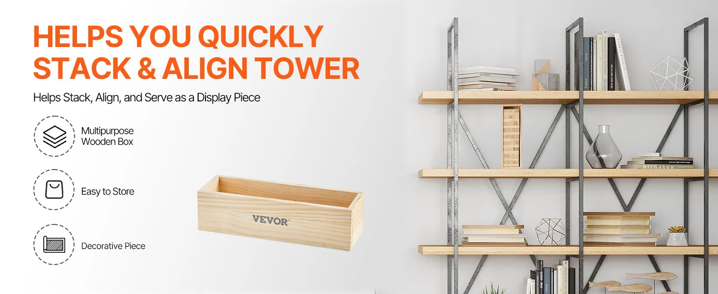 The wooden box helps you quickly stack and straighten the tower. It also doubles as a storage box or decorative display.