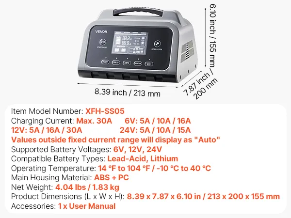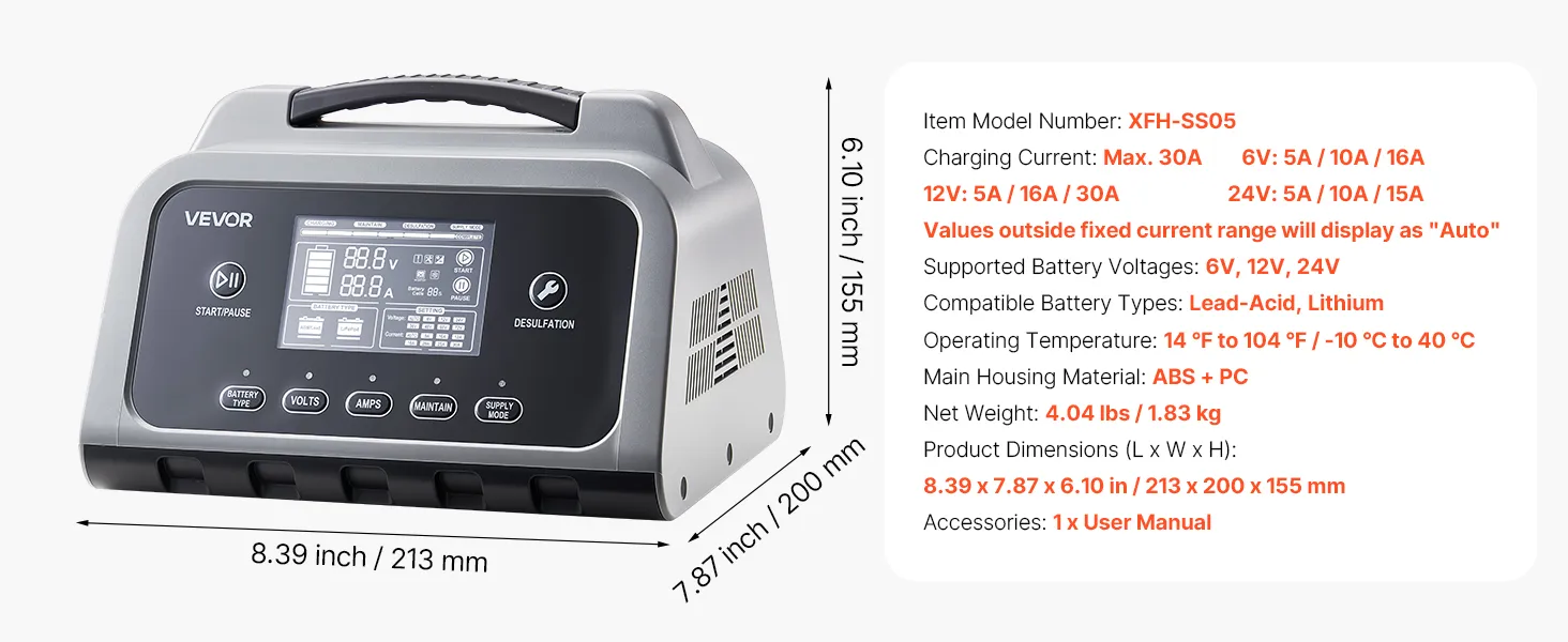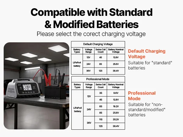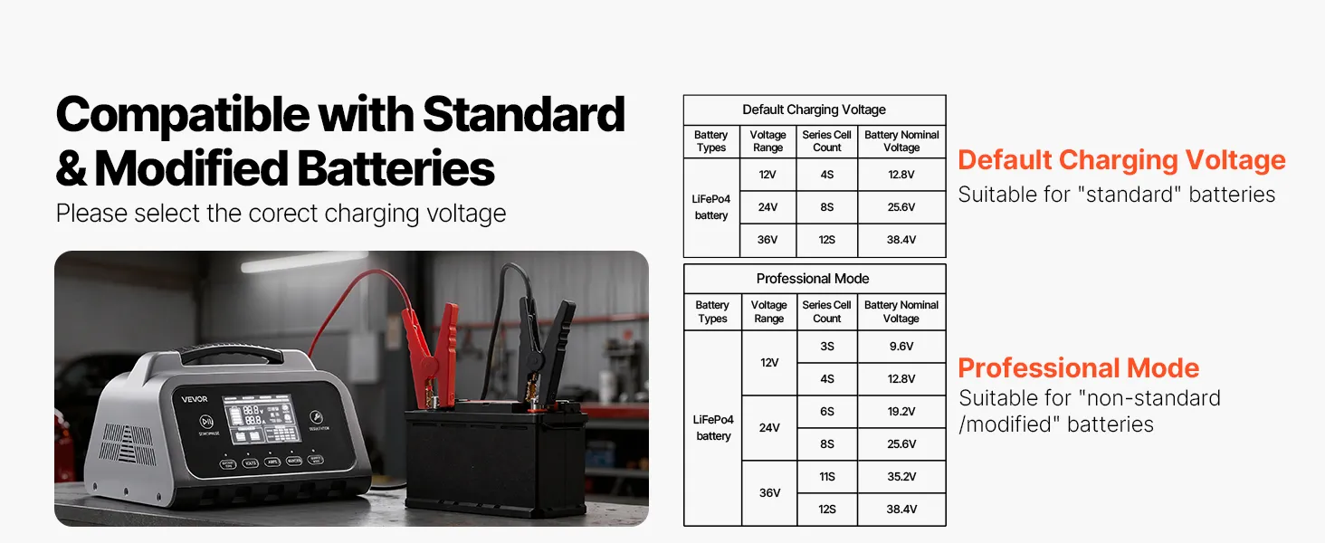 30A acculader: Deze intelligente acculader ondersteunt 6V, 12V en 24V loodzuuraccu's (natte, gel-, MF-, CA-, EFB-, AGM- en calciumaccu's) en 12V en 24V LiFePO4-accu's. Hij levert een uitgangsvermogen tot 30A met instelbare spanning en stroomsterkte, en heeft een professionele modus voor niet-standaard accu's.