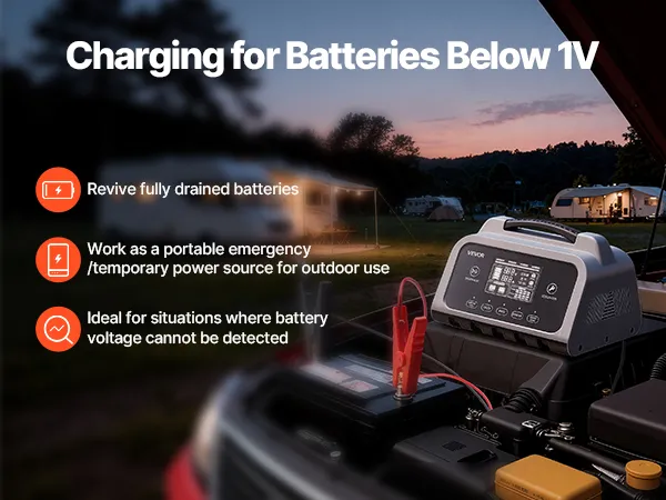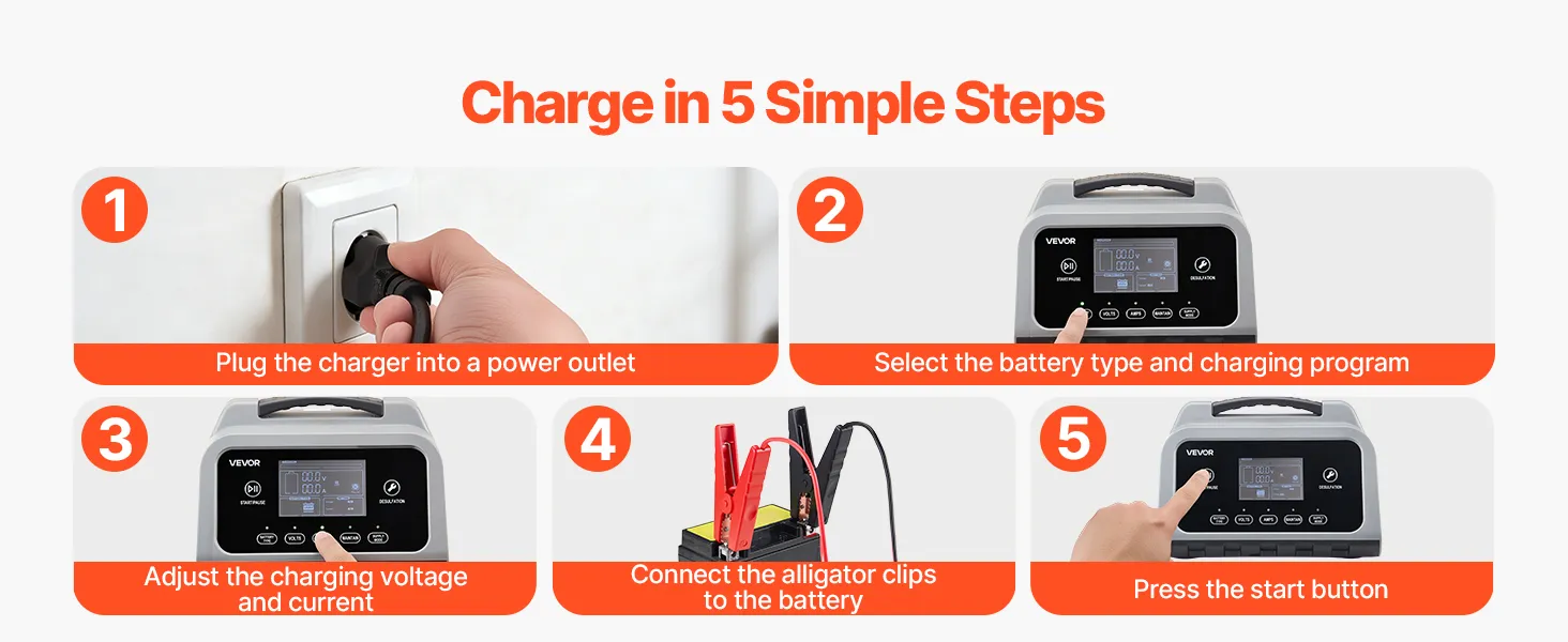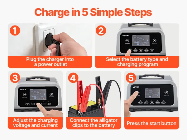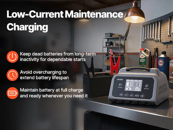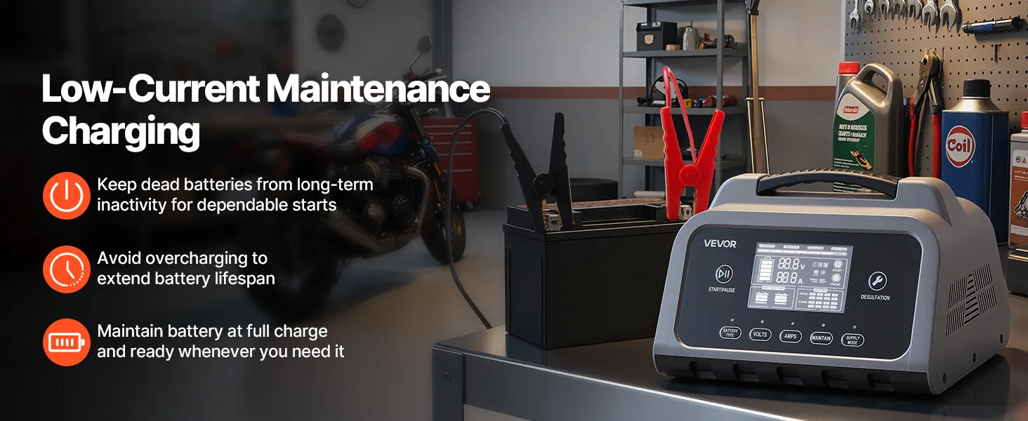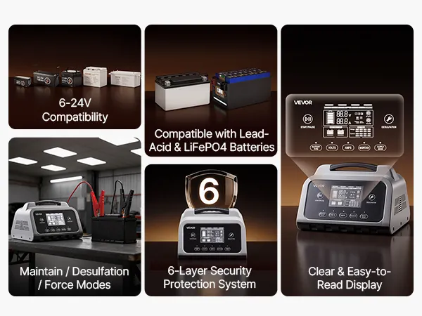 Vier intelligente laadmodi: Deze autolader biedt een laadmodus met 7-traps intelligente laadtechnologie, een onderhoudsmodus voor onderhoud met lage stroomsterkte, een ontzwavelingsmodus voor het regenereren van verouderde accu's en een snellaadmodus voor het activeren van accu's onder 1V.