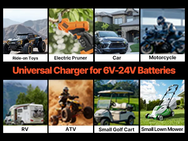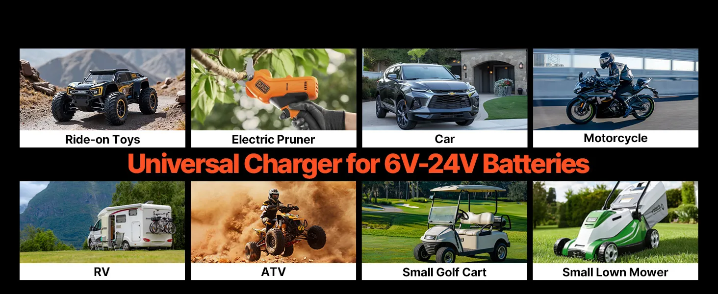 Breed scala aan toepassingen: Een LiFePO4 lithiumbatterijlader voor kleine en grote apparaten, ideaal voor elektrische zitmaaiers, elektrische tuinschaaren, auto's, motoren, campers, quads, kleine golfkarretjes en compacte grasmaaiers – voldoet aan al uw laadbehoeften.