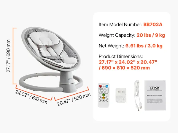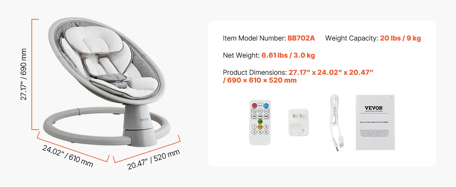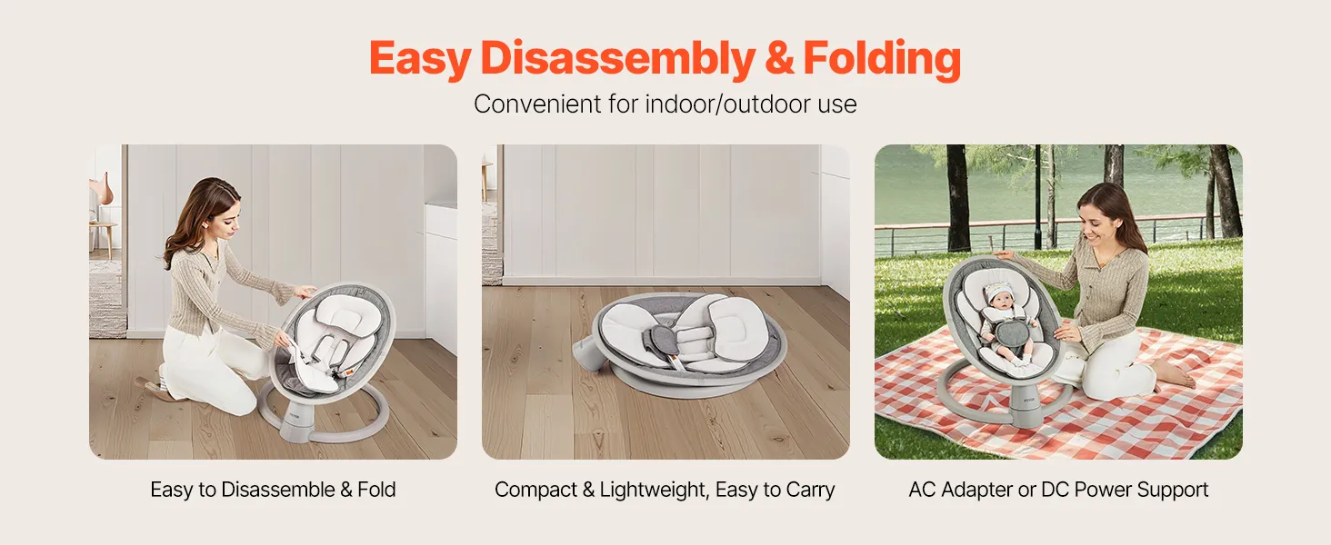 Weighing just 8.16lbs, this compact baby swing is easy to fold and take anywhere. Powered by 4 AAA batteries (not included), USB, or electric supply, with a 2-meter long power cord, it’s ideal for both indoor and outdoor use, making it a portable baby swing for on-the-go parents.
