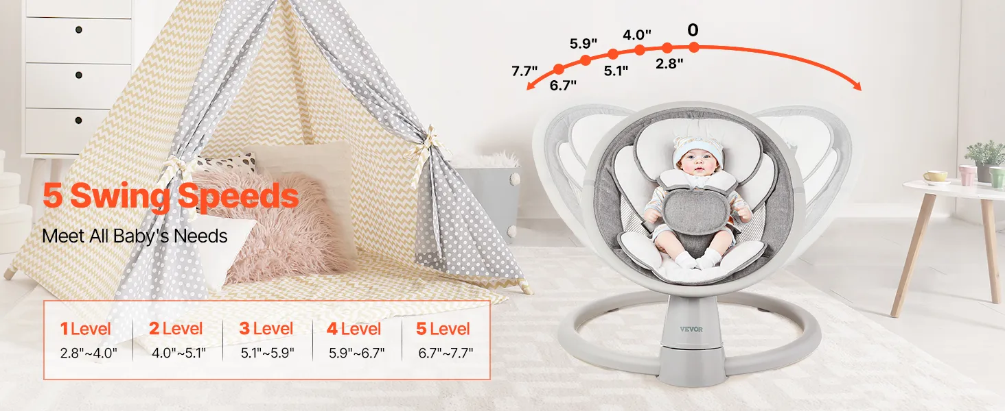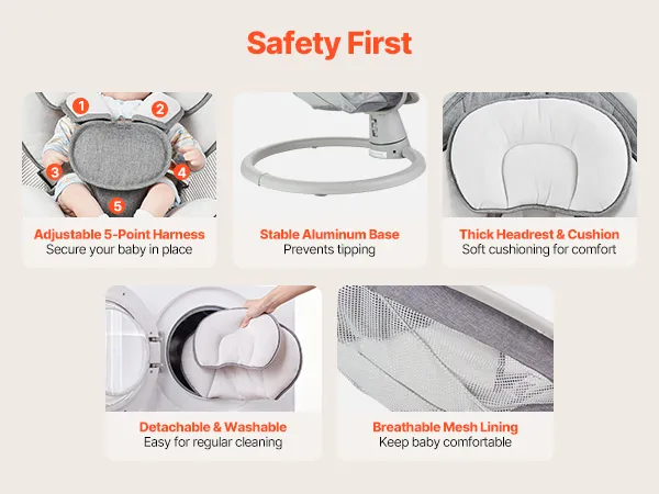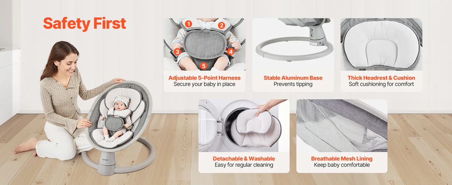 Security First, Fun Forever: Our baby swing chair features a one-piece circular aluminum base for enhanced stability and a seat angle lock for added safety. The 5-point harness keeps your baby secure, while adjustable shoulder pads offer extra comfort.