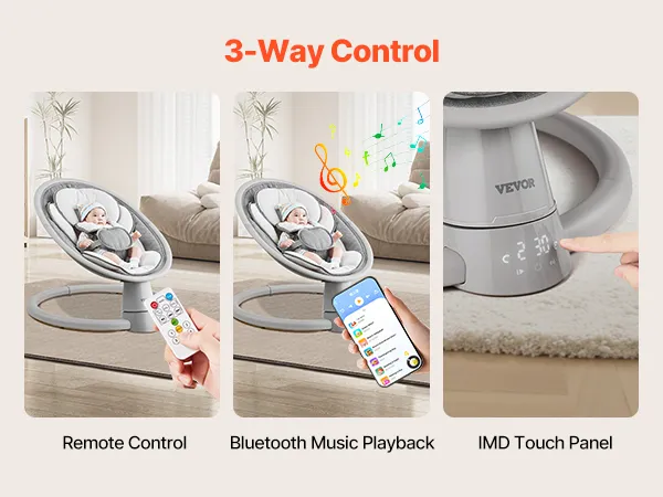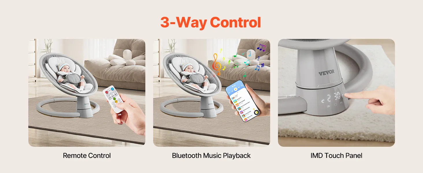 Offer 3 control options to meet your needs. The remote control lets you adjust music and swing speed from a distance. Choose from 10 preset lullabies or connect via Bluetooth to play music from your phone ; smart touch panel clearly displays functions, easy for new parents to operate.