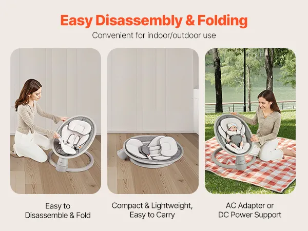 Portable & Travel-Friendly: Weighing only 8.16 lbs, this compact baby swing for newborn can be easily disassembled and folded, taking up minimal space. With versatile power options—4 AAA batteries (not included), USB power bank charging, or 2m power cord—it’s ideal for indoor and outdoor use. Take it with you wherever you go, and keep your baby comfortable and calm on the go.