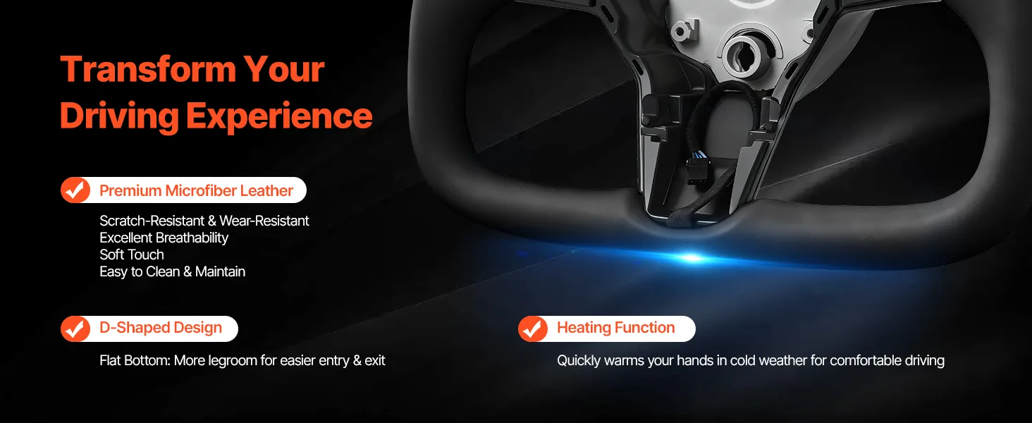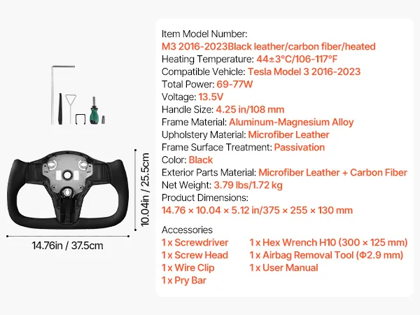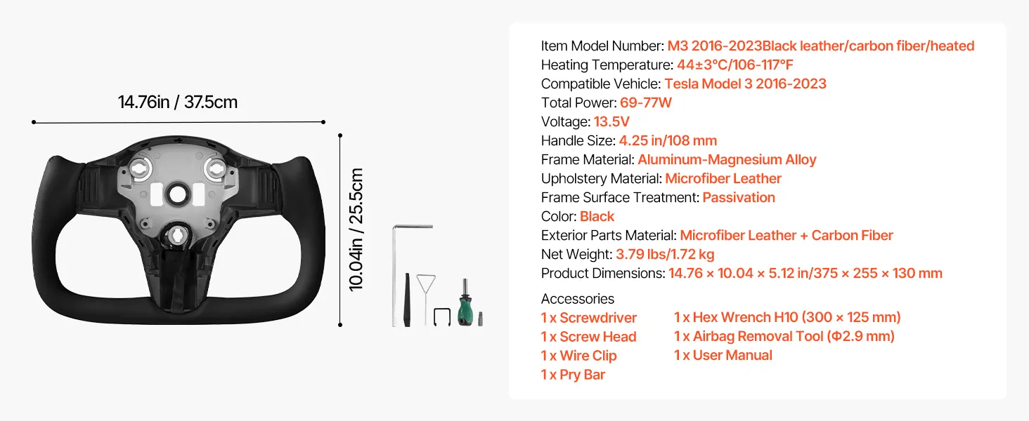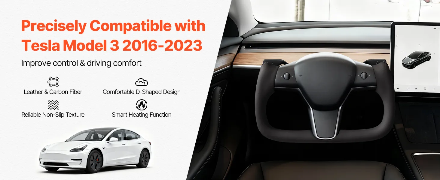 VEVOR-stuurwiel voor Tesla Model 3 (2016-2023), D-vormig stuurwiel van koolstofvezel, afgeplat aan de onderkant, met verwarmingsfunctie, lederen grip met antislipoppervlak, vervangingsonderdeel voor Model 3, zwart