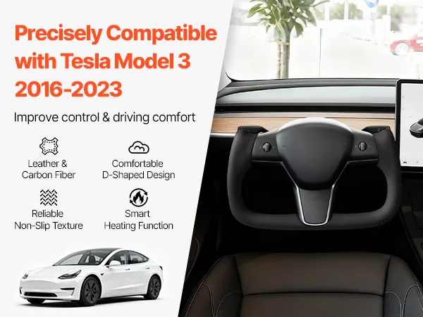 Dit stuurwiel is speciaal ontworpen voor de Tesla Model 3 (2016-2023) en past perfect in uw auto. Het verbetert de wegligging en het rijcomfort. Gemaakt van leer en koolstofvezel, zorgt het D-vormige ontwerp met een antislipoppervlak voor een veilige en comfortabele rijervaring.