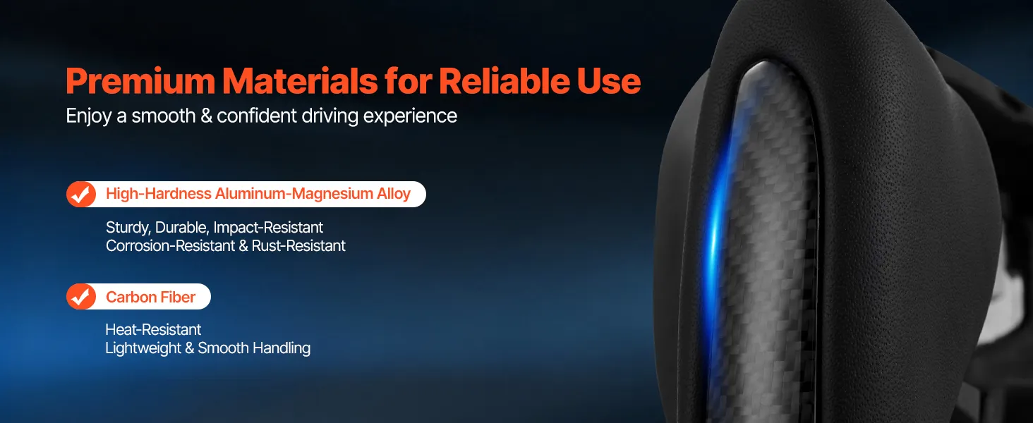 Leer en koolstofvezel: Ons stuurwiel, vervaardigd uit hoogwaardig leer en koolstofvezel, biedt een comfortabele grip. Het koolstofvezelmateriaal zorgt voor stabiliteit en uitstekende tactiele feedback. Dankzij het lichtgewicht ontwerp worden de rijprestaties geoptimaliseerd.