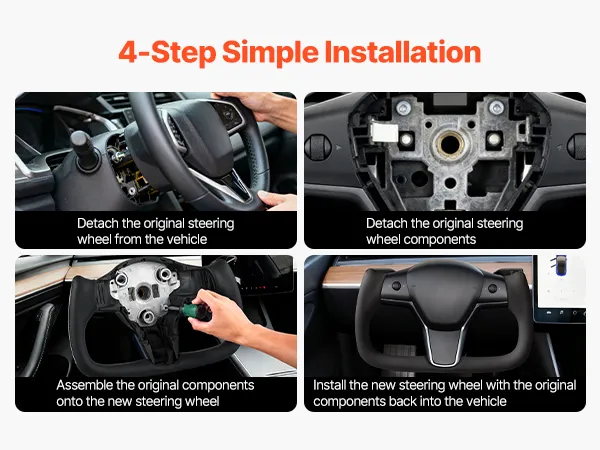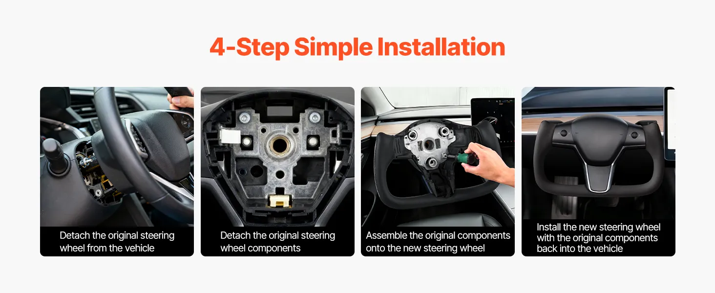 Het monteren van dit stuurwiel met afgeplatte onderkant is heel eenvoudig en bestaat uit vier stappen: 1) Verwijder het originele stuurwiel; 2) Verwijder de originele onderdelen; 3) Monteer de originele onderdelen op het nieuwe stuurwiel; 4) Monteer het nieuwe stuurwiel. Geen speciale vaardigheden vereist – upgrade in enkele minuten.