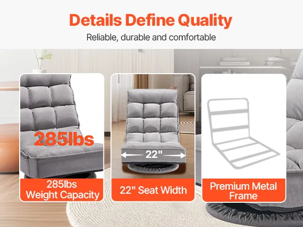This swivel floor chair combines several thoughtfully designed features, such as a high-quality steel frame and a spacious seat width, creating a sitting and reclining experience that is both stylish and functional.