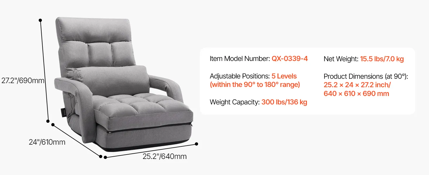 Multiple Backrest Adjustments: With up to 5 adjustable positions, this floor chair allows you to adjust the backrest from 90° to 180°, providing the comfort for reading, working, relaxing, or resting, meeting a variety of lifestyle needs.