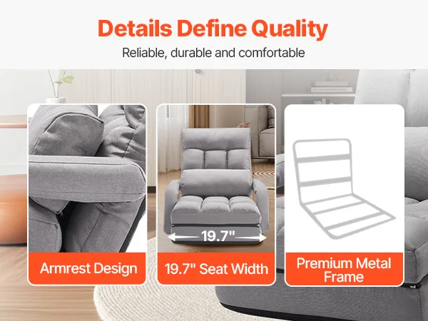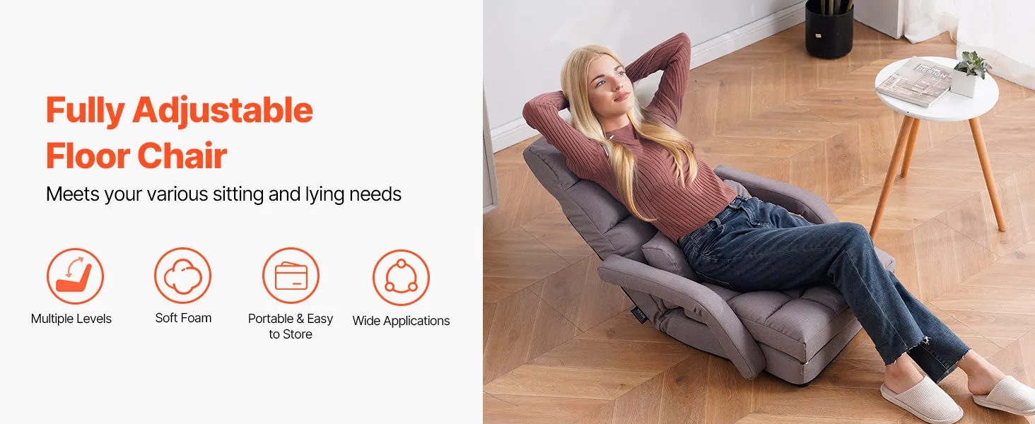 VEVOR Floor Chair, Floor Gaming Chair with 5 Adjustable Position and Back Support, Folding Sofa Chair with Armrest for Adults, Sofa Lounger Bed with Back Cushion for Living Room and Bedroom, Gray