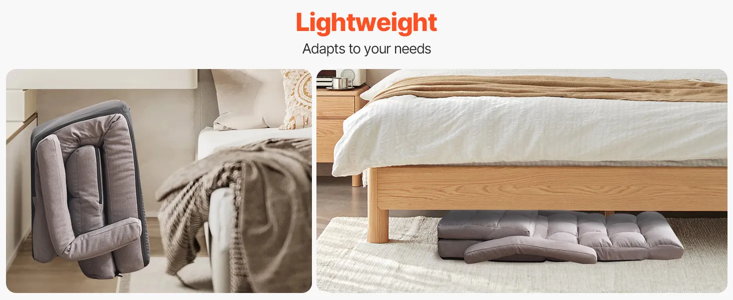 This folding floor chair is not only foldable for space-saving storage against a wall, but it can also lie flat when unfolded, easily fitting under a bed or sofa without taking up extra space. It meets the storage needs of different users.