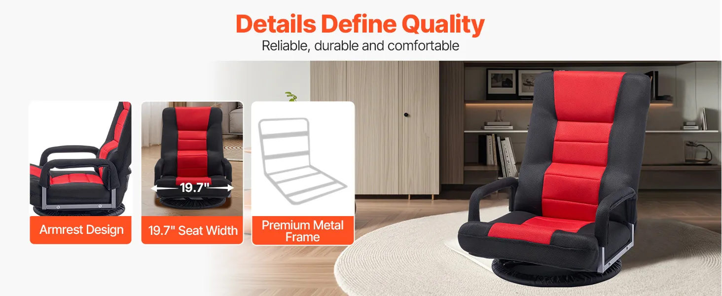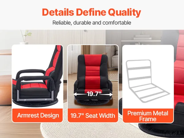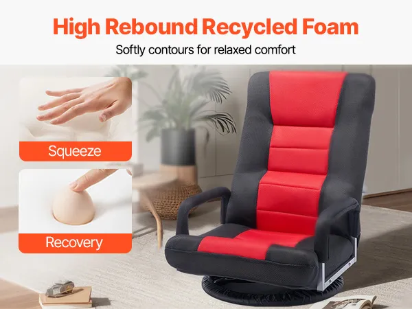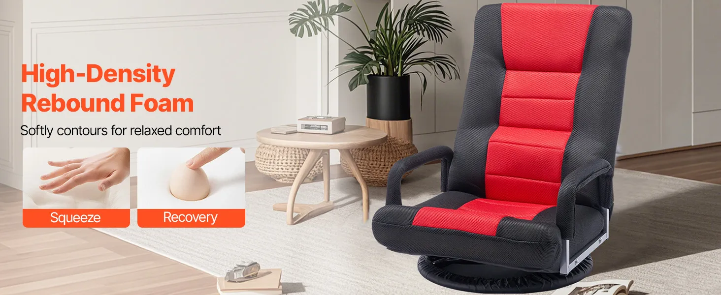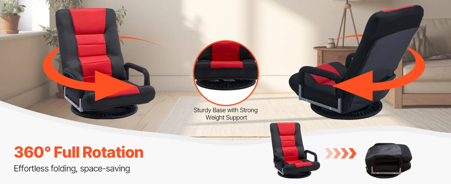 VEVOR Swivel Floor Gaming Chair with Armrests, 360-Degree Rotating Floor Chair with 6 Adjustable Position Folding Backrest and Lumbar Support, Folding Video Reclining Sofa for TV Reading, Red Black