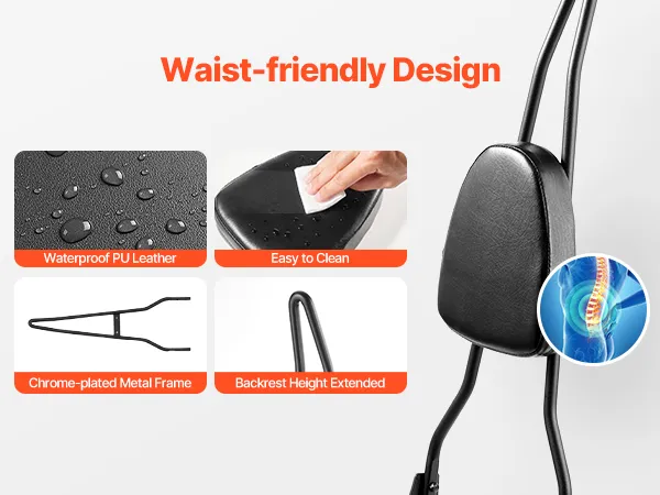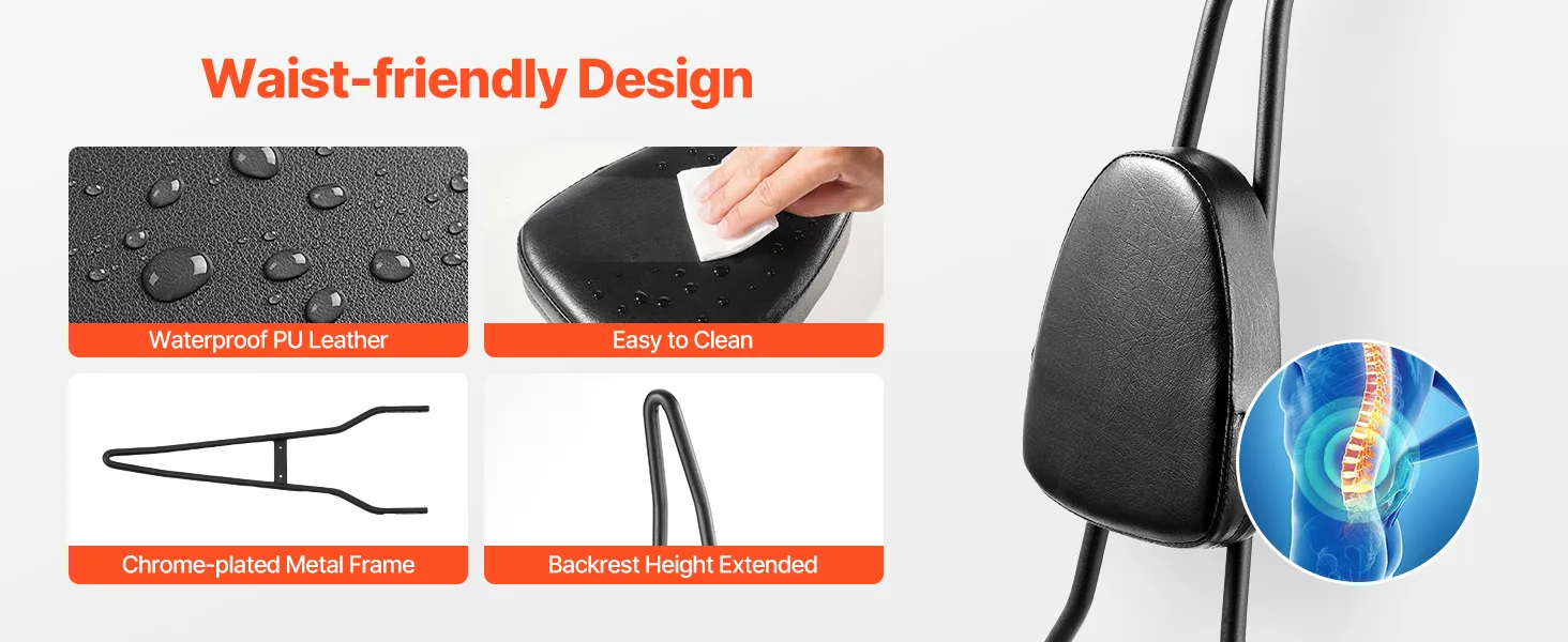 Comfortabele rijervaring: De leren rugleuning is waterdicht en beschermd tegen krassen, slijtage, vlekken en spatten. De schuimvulling met hoge dichtheid en ergonomisch ontwerp verlicht de druk op de lendenstreek en zorgt voor stabiliteit en comfort, zelfs op oneffen wegen