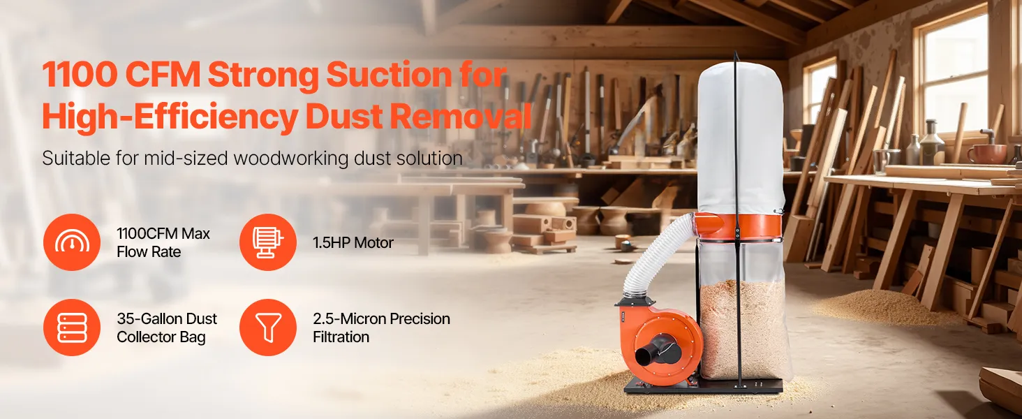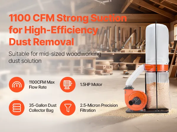 Hoge luchtstroom: Met een zuigcapaciteit van 1868,91 m³/u (1100 CFM) zuigt deze draagbare stofafzuiger snel grof zaagsel en fijn vuil op. De sterke, constante luchtstroom verwijdert efficiënt stof, verbetert de netheid van de werkplaats en zorgt voor ononderbroken, soepele houtbewerking.