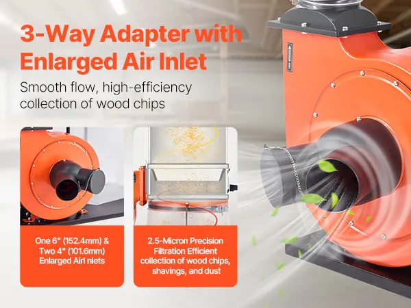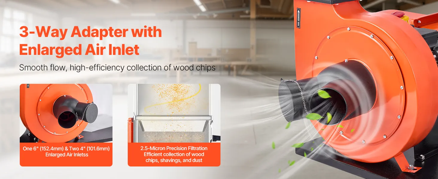 Uitgerust met één inlaatopening van 152,4 mm (6 inch) en twee van 101,6 mm (4 inch) vangt deze houtstofzuiger efficiënt meer stof en fijnstof op. De grotere openingen verbeteren de luchtstroom, verminderen verstoppingen en zorgen voor snellere en soepelere reiniging tijdens middelgrote en kleine houtbewerkingswerkzaamheden.